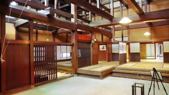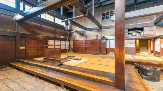 _x0008_這棟建築建成於明治41年(1908年)。它曾經是酒坊,因此至今房簷下還懸掛著大酒幌。_x0008_建築物內部通過以頂樑柱為中心由多根橫樑與垂柱構成的通風天井,光線由高窗灑向屋內,使房柱與壁板的木紋之美盡現,體現了當時日本建築的水平。