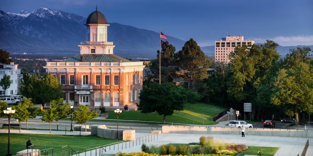 猶他州議會大廈是一座新古典主義建築,建於1912年到1916年。 1978年列入國家史蹟名錄。大廈位於美國猶他州鹽湖城的議會山,俯瞰市中心,為州長辦公室和州議會所在地。遊客可以在此欣賞到精美的建築細節,包括大理石柱、華麗的圓頂和精緻的壁畫,這些都講述了猶他州的歷史和文化。