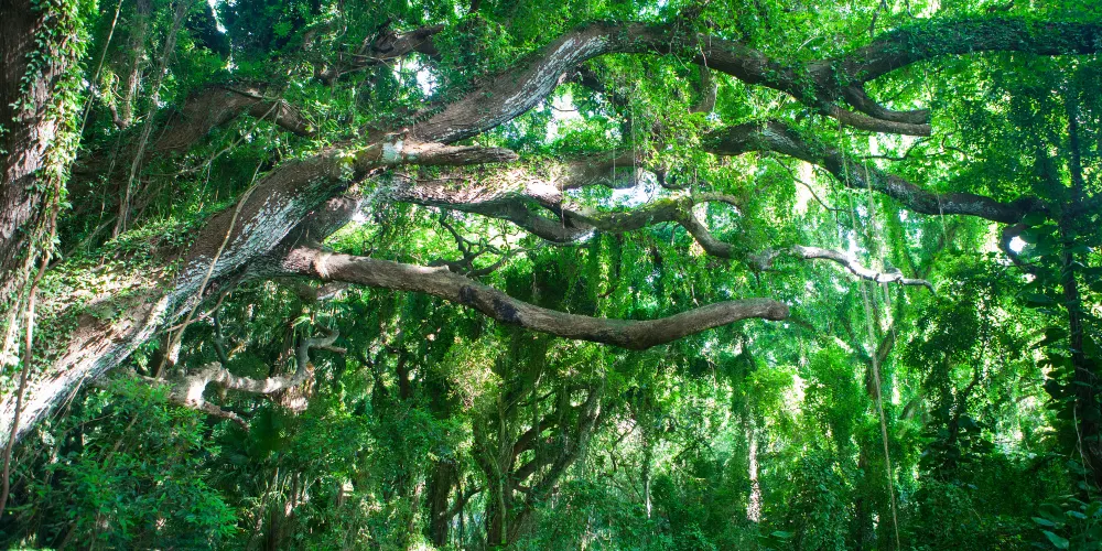 三寶樹是因三株特殊的古樹而得名的,兩棵柳杉,一棵銀杏。因這三樹在黃龍寺山門前,有“廟堂之寶”的稱譽,故名“三寶樹”。此處濃廕庇日,綠浪連天,三棵參天古樹凌空聳立,二棵是柳杉,各高40餘米,一棵為銀杏,高約30米,主幹數人合抱不攏,形同寶塔。三寶樹相傳為千年古可柯,樹下石碑上鐫有“晉僧曇詵手記”6字。寶樹已被重點保護。據樹下巨巖上所刻“婆羅寶樹,僧曇詵手桿"十字來看,已有一千六百多年。曇詵為大林寺創始人,東林寺高僧慧遠的弟子。