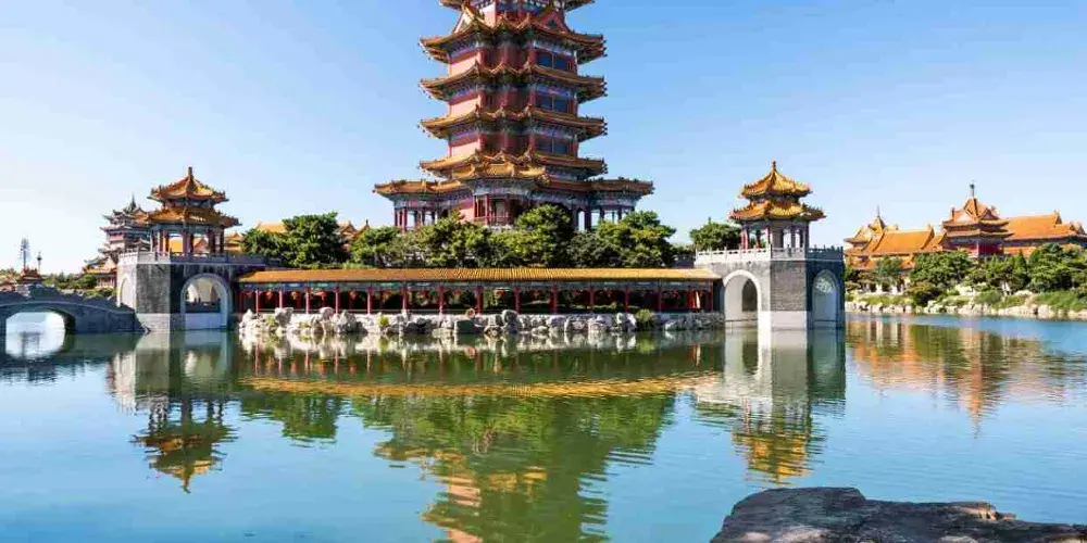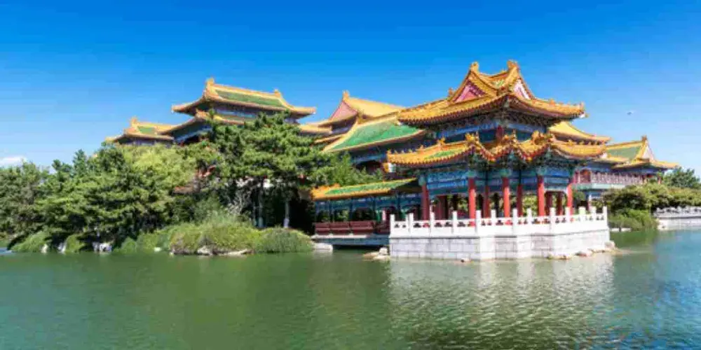 進入景區先來到和氣大殿,殿中供奉孔子、老子、釋迦牟尼像,其中釋迦牟尼佛像是用緬甸水白玉精雕而成,孔子像、老子像分別用紫銅鍍金彩繪而成,神態莊嚴。接著參觀園中的主體建築蓬萊仙島、方壺勝境、瀛洲仙境,均是建造在人工湖之中的巍峨建築,登上高閣可俯瞰園內全景。