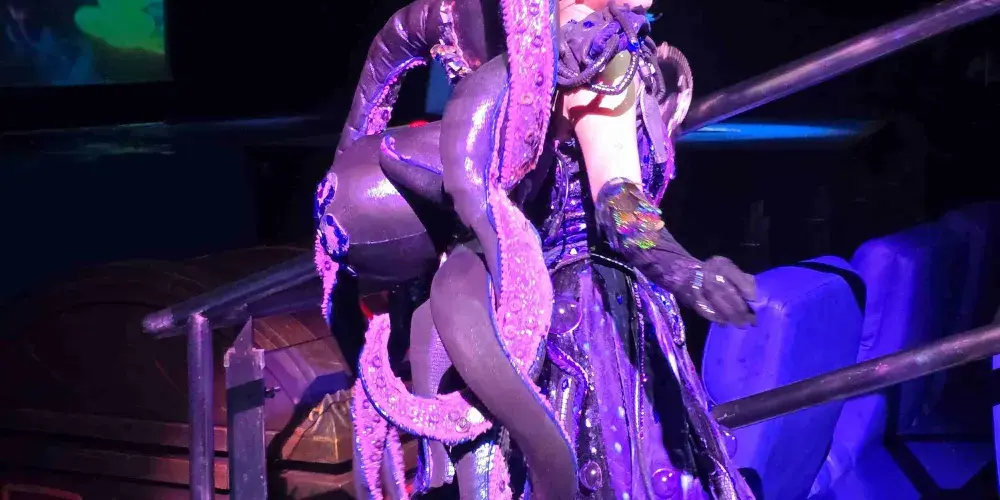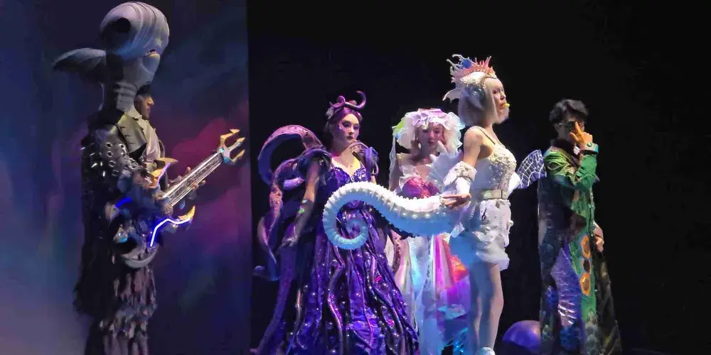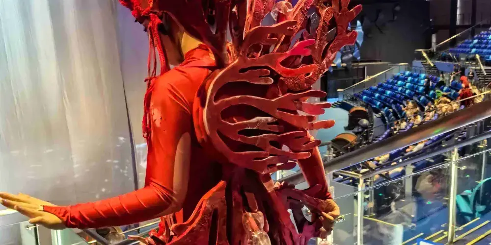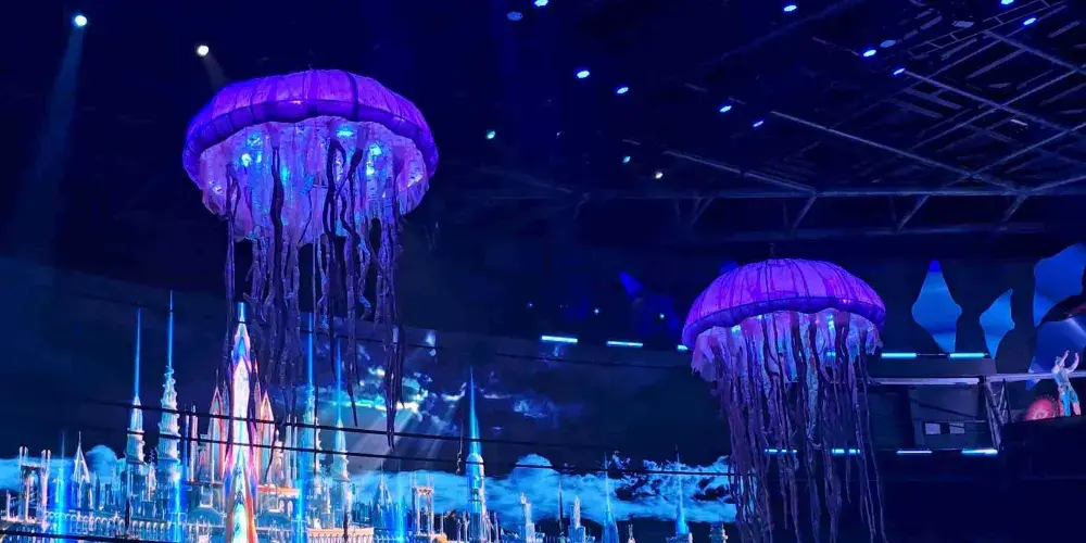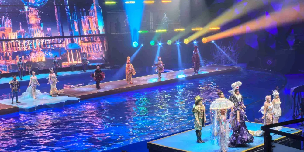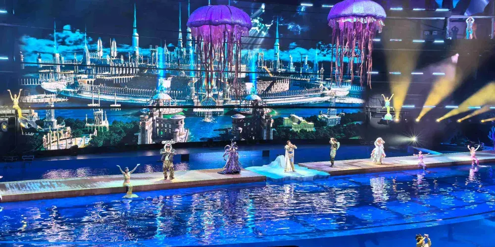 水陸空3D立體舞台:蓄7,000立方公尺天然海水打造水舞台、40公尺曲面LED巨幕、即時動態投影,呈現「海中神殿」「冰河祕境」「深淵戰場」等多維場景。