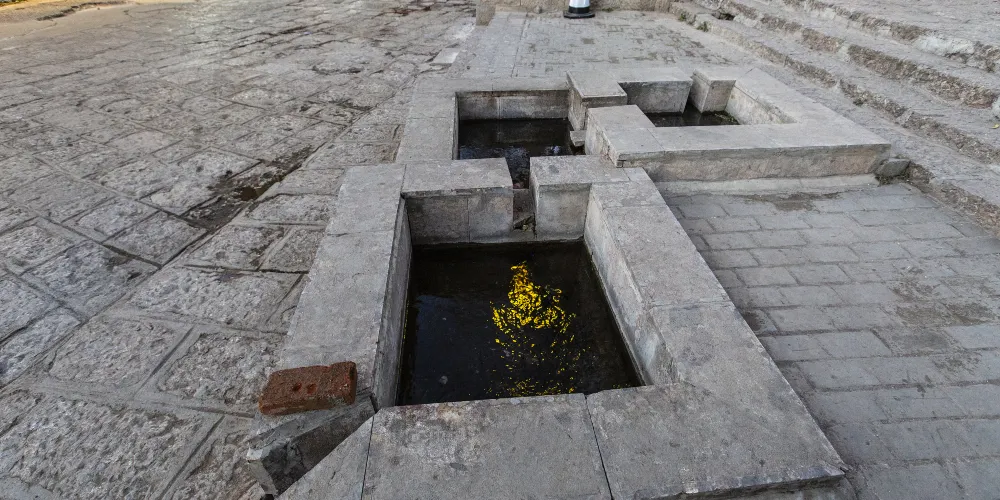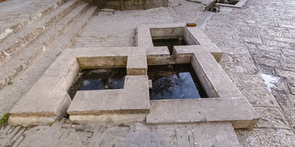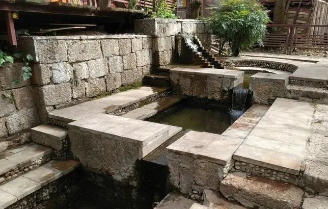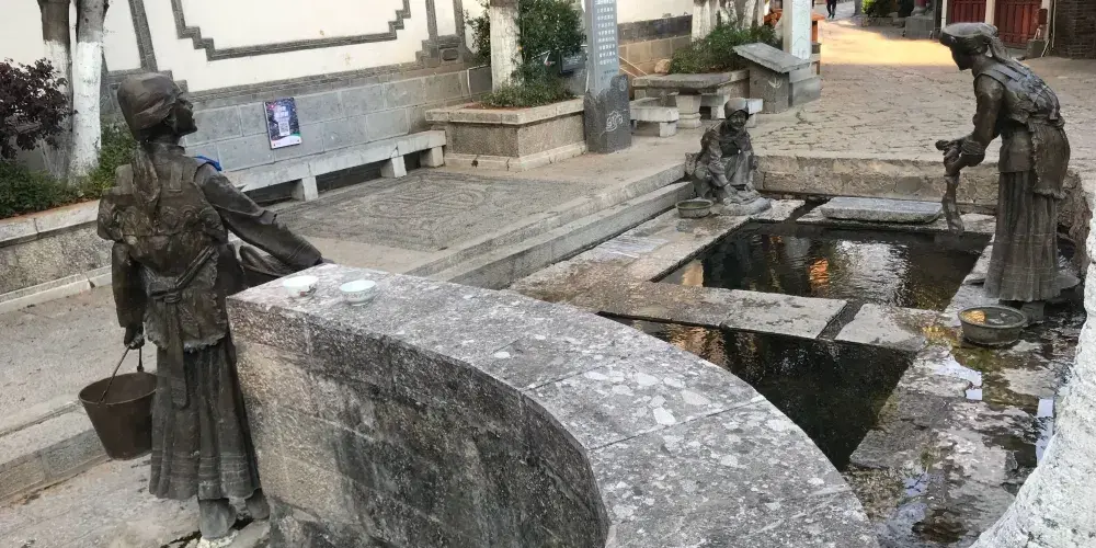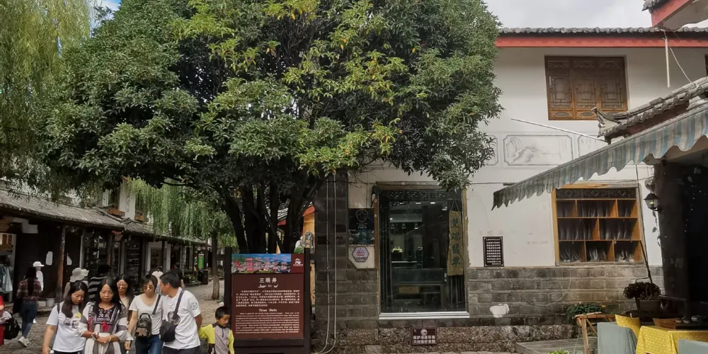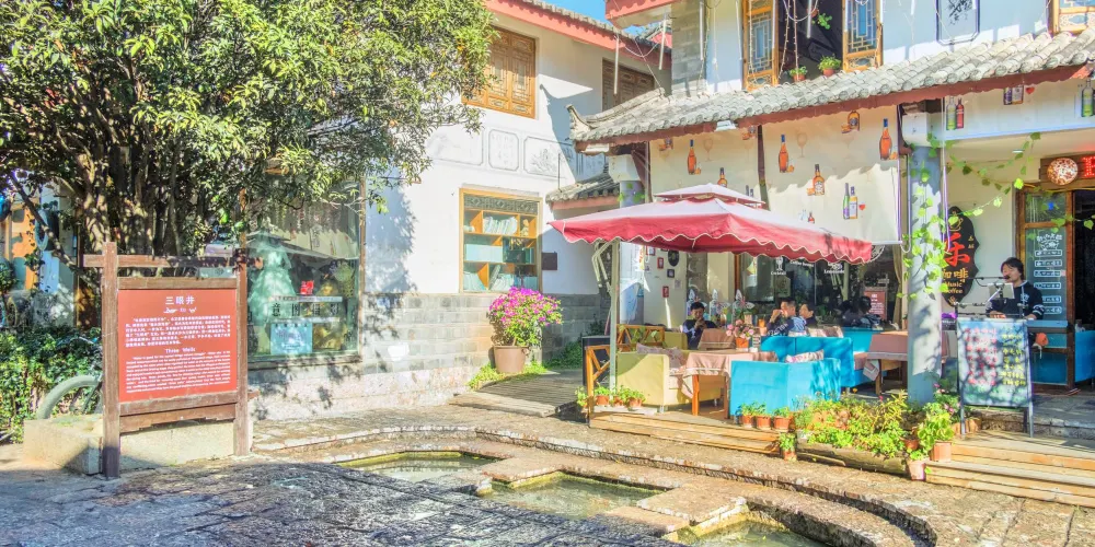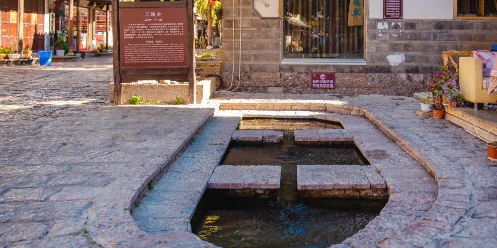 束河三眼井位於束河古鎮內,三眼井是麗江地區古老節水方式的體現,利用水的流勢,由上而下建造了三口井潭,水由上面的潭一直向下流淌,流到第三口潭之後再流走。而三口潭也有各自的用途,由上而下分別作為人飲用、淘米洗菜用和牲畜飲用,這種特別的製井方式體現了納西族人古老的節水環保觀念。