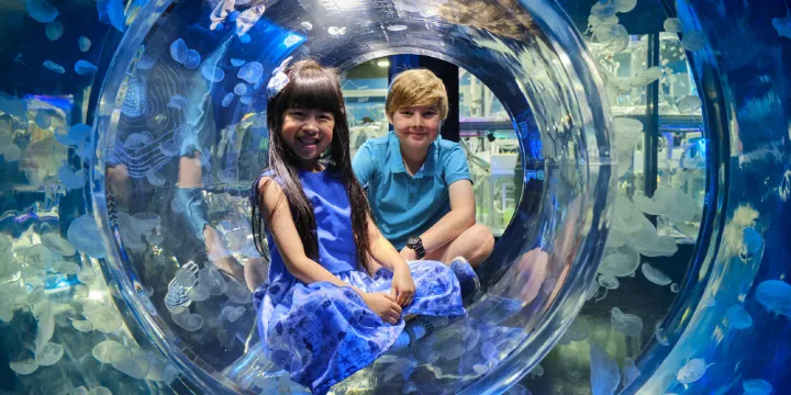 墨爾本水族館坐落在被譽為“南半球的泰晤士河”的亞拉河畔,外觀是以藍白色相間為主的圓弧型的4層樓建築,館內分地上、地下兩層,設有12個精彩主題探索區,給你帶來難以忘懷的遊玩經歷。這裏生活着鹹水鱷、海馬、海龜、烏賊、海龍、鯊魚、海星、帝企鵝等豐富物種。在這裏,不僅能近距離地觀察到澳洲特有的海洋生物,親手觸摸各種各樣的海洋貝類,還可以欣賞潛水員和魚羣一起同舞,乘坐透明的玻璃底船在水面上自由划行。