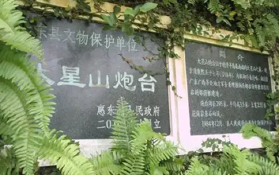 大星山炮台位於港口鎮最南端的大星山西南面,是平海諸炮台中保存得相當完好的炮台。東、西、南三面臨海,地勢險要,易守難攻,是曆代兵家必爭之地。鴉片戰爭前夕,帝國主義列強不斷派兵侵略中國,為抵禦外來侵略,清康熙五十六年(1718年),廣東、廣西地方軍務兼理糧餉兵部右侍郎兼都察院右副都等捐銀在此建造炮台,築成軍事要塞。炮台用麻石砌築,周長295米,平均高3.5米,寬2.55米。東北各有一石門,門高1.96米,寬1.63米。據碑文記載,當時在炮台內設營房22間,火藥局(庫)1間,由安兵600名和把總1員駐防。炮台由東向西呈長方形,戰壕縱橫,城牆則蜿蜓似起臥的盤龍,氣勢雄偉壯觀。大星山炮台現為惠東縣文物保護單位。