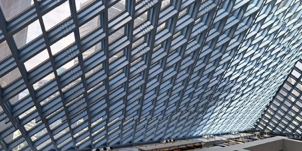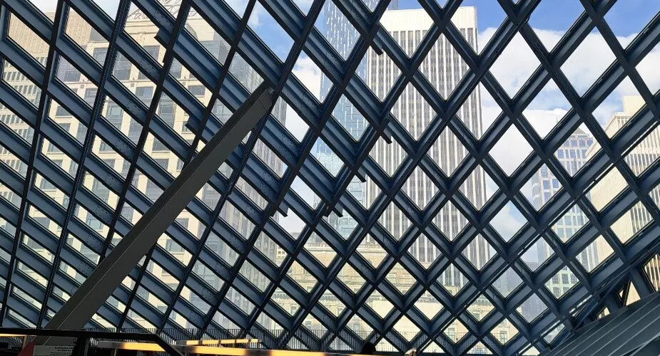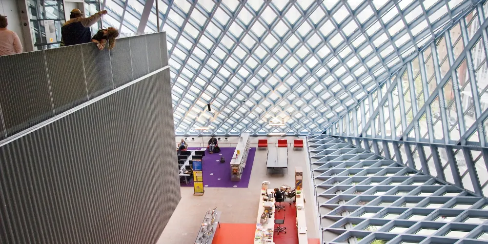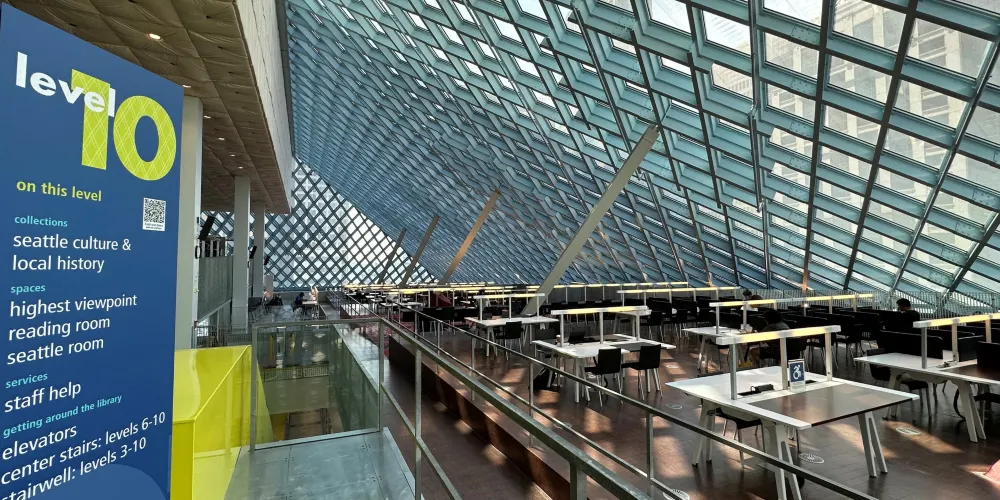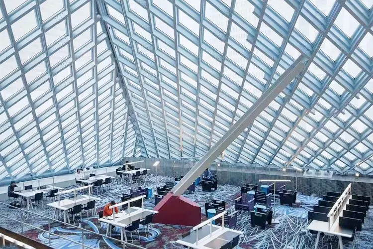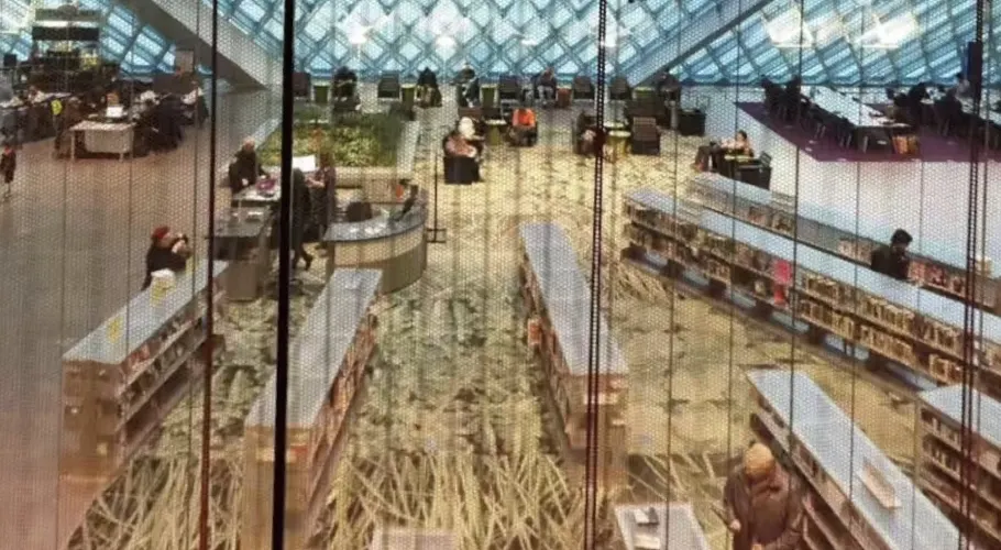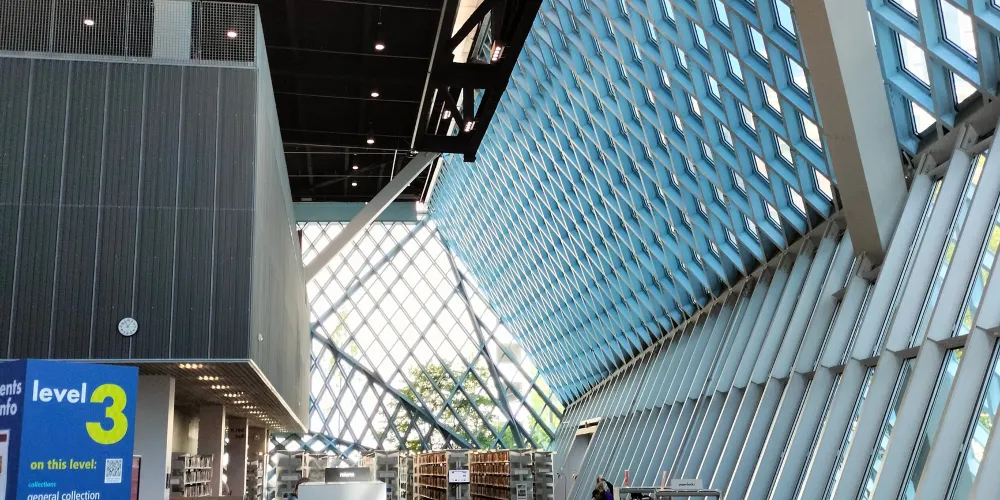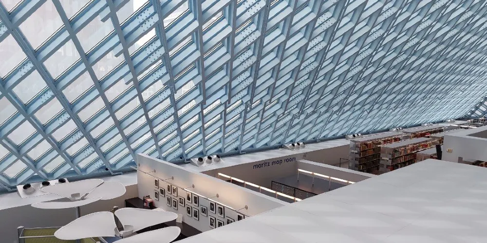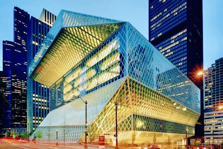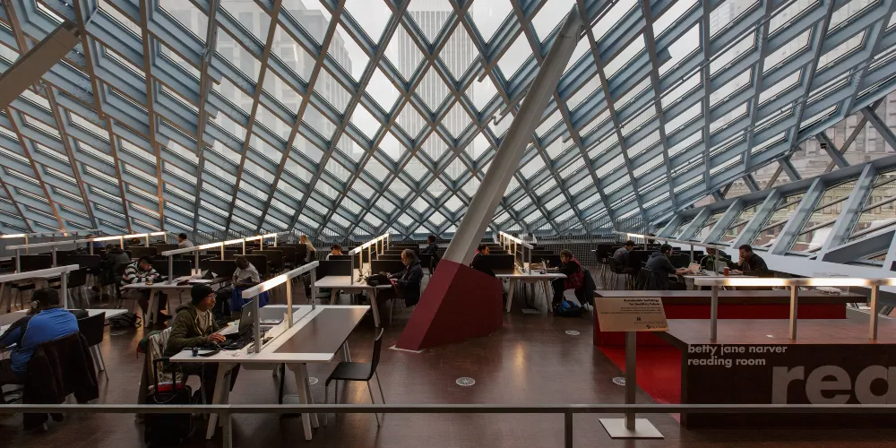 西雅圖中央圖書館由世界著名的荷蘭建築師Rem Koolhaas設計,採用玻璃鋼結構建造,呈半透明狀。這樣的設計,使街道上的行人都可以直接看到圖書館的內部。圖書館裡面有許多的海綿椅,有竹地板,金屬刷,還有植物圖案的地毯。對位於圖書館室內的人來說,可以擁有很寬的視野,而部分透明的玻璃結構在閱覽區內還能夠提供柔和的室外光線,並可防止眩光。
