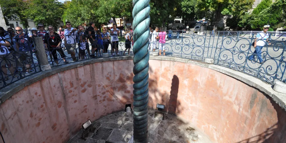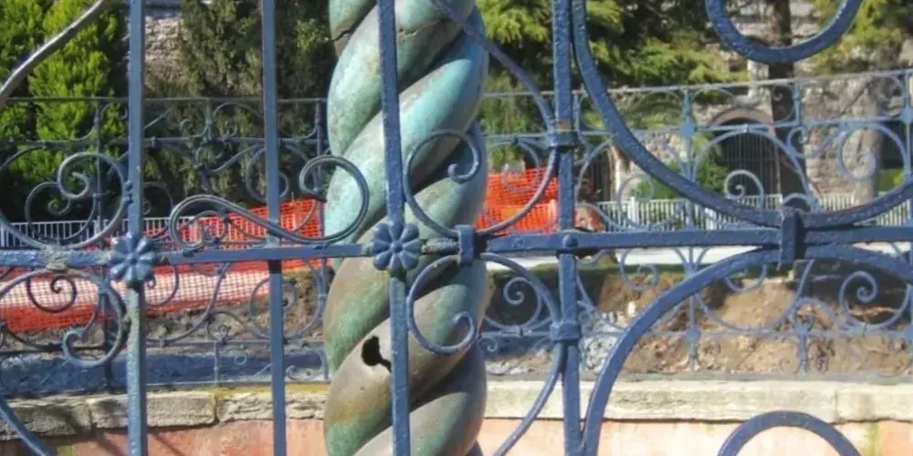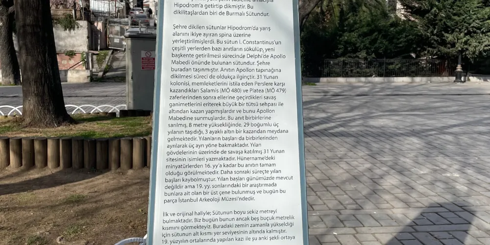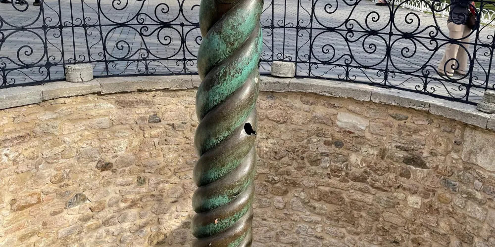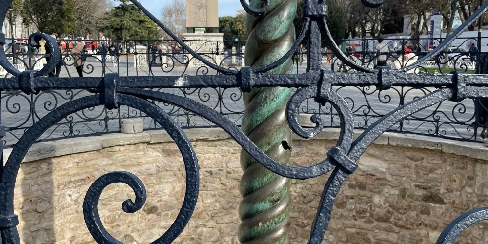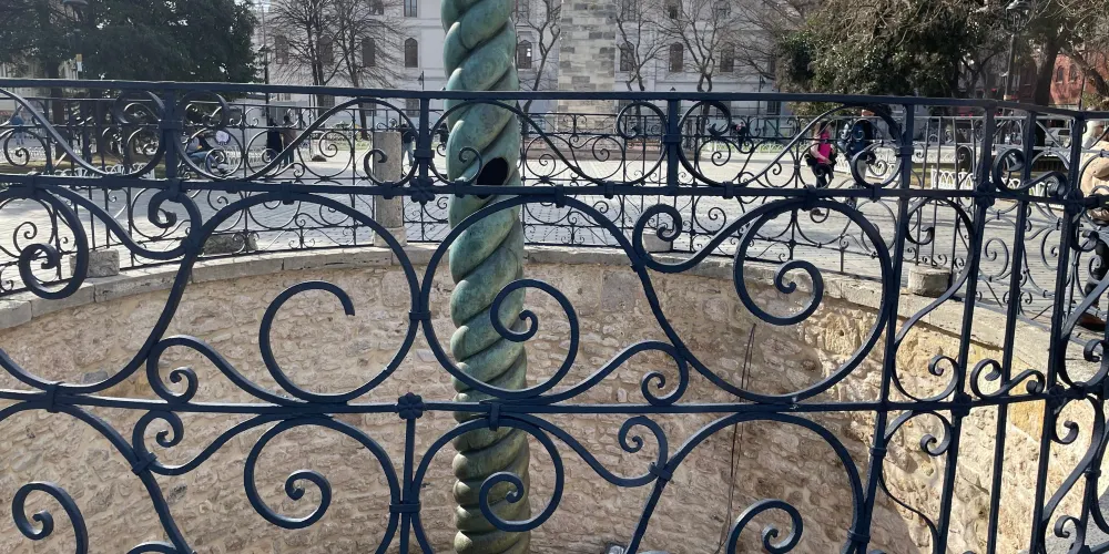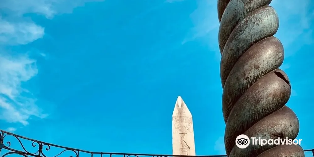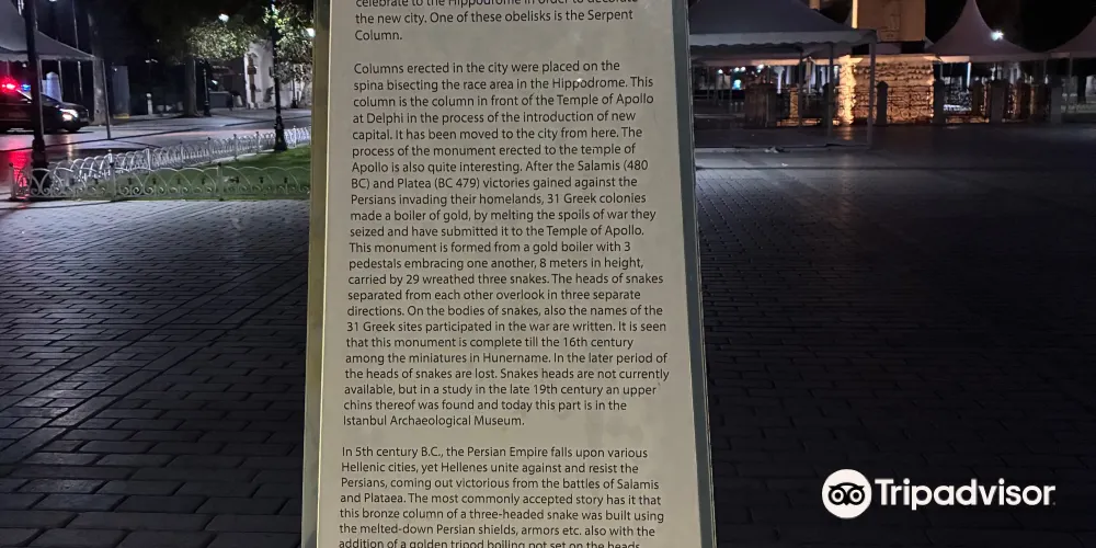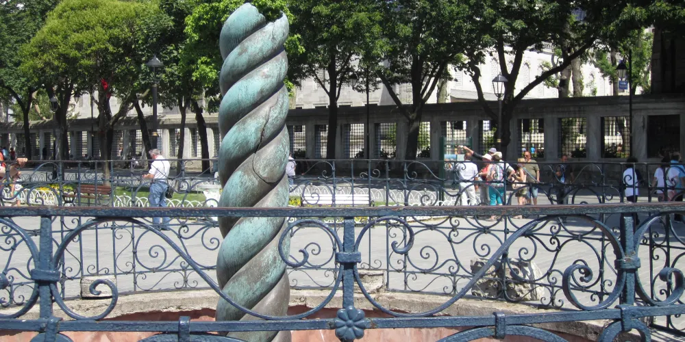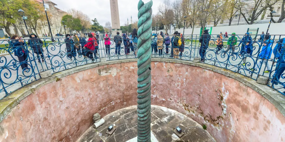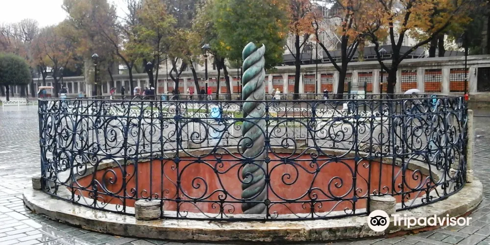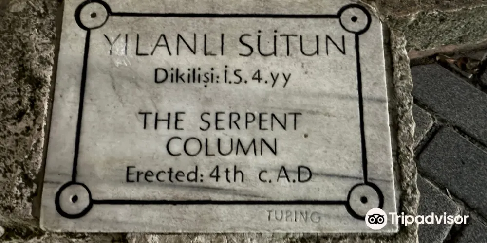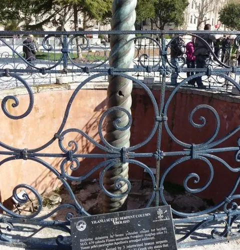 蛇柱又稱德爾斐三腳祭壇或普拉提亞三腳祭壇,是一根古代銅柱,位於土耳其伊斯坦堡的君士坦丁堡賽馬場。它是古希臘三腳祭壇的一部分,起初位於德爾斐的阿波羅神廟,在公元324年被君士坦丁大帝移往君士坦丁堡。在8公尺高的柱頂曾有3個蛇頭,一直存在到17世紀末,其中一個蛇頭的部分現在在附近的伊斯坦堡考古博物館展出。蛇柱因其精美的雕刻和悠久的歷史吸引許多遊客和歷史愛好者。遊客可以在廣場漫步,欣賞這座古老的紀念碑,並感受背後的歷史故事。