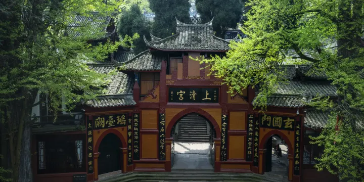 上清宮是青城山中的道觀,始建於晉代,現存殿宇建於清代同治年間(1862-1874年)。門樓匾額上的“上清宮”三個大字,是蔣介石1940年手書。宮內有老君殿、三清殿、文武殿和道德經堂,香火旺盛,大多數遊人到這裡都會燒香祈福。上清宮門口有觀日亭,適合觀賞日出。
