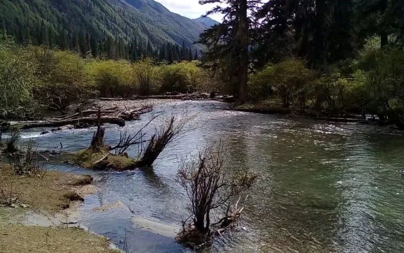 則評價枯樹灘是一片開闊的河床,當中兩條細小而清澈的河水靜靜地流淌。相傳枯樹灘是阿巴朗依與墨爾多家族交戰的遺跡,墨爾多用法術招來洪水,洪水淹死了阿巴朗依的軍隊,死去的士兵們化成了高大的樹幹,後來洪水退去,樹幹依然屹立在這裡。枯死的沙棘、雜木留下一片枯樁置於河灘,故稱“枯樹灘”。砂石河灘上的枯樹形態各不相同,有的高大挺拔,有的橫於河灘的小河之上,景緻十分獨特。
