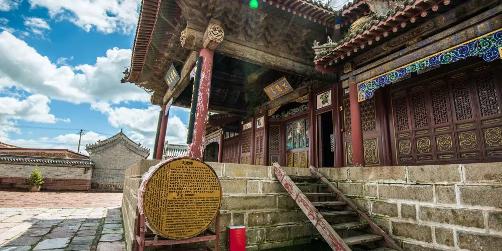 山西會館位於多倫城區的西南部,是清乾隆十年(1745年)由山西籍旅蒙商集資興建的。建館的目的,就是為方便山西同鄉來往交流,併為剛來此地的鄉友提供落腳安身之處。山西會館是多倫老城區保存比較完好的一處清代古建築羣,至今已有250餘年的歷史了。會館座北朝南,大致可分為住宿區、娛樂區、商會議事區和關帝廟。會館的大門前,有一座高大的牌樓,雕樑畫棟,晉商之富由此可見一斑。大戲樓是會館的一座“明星”建築。這座大戲樓全由方形條石砌成,恰好是一個“凸”字型。台上有粗粗的明柱支撐這戲樓的前半部分,樓頂四角鳥嘴似的正檐斜刺蒼穹。其東南角,上面懸掛一面明鏡,面向西北,可以映照數裡外的善因寺。據考古學家介紹,採用這種建築結構形式的,在中國僅有兩座。會館的娛樂區就主要以這座大戲樓為中心。每年的五月十三開台唱戲,一直唱到秋後天涼。到六月十五多倫廟會期間,會館內的演出活動往往達到高潮。正月十五左右也要演出幾日,所唱劇種自然非山西梆子莫數了。