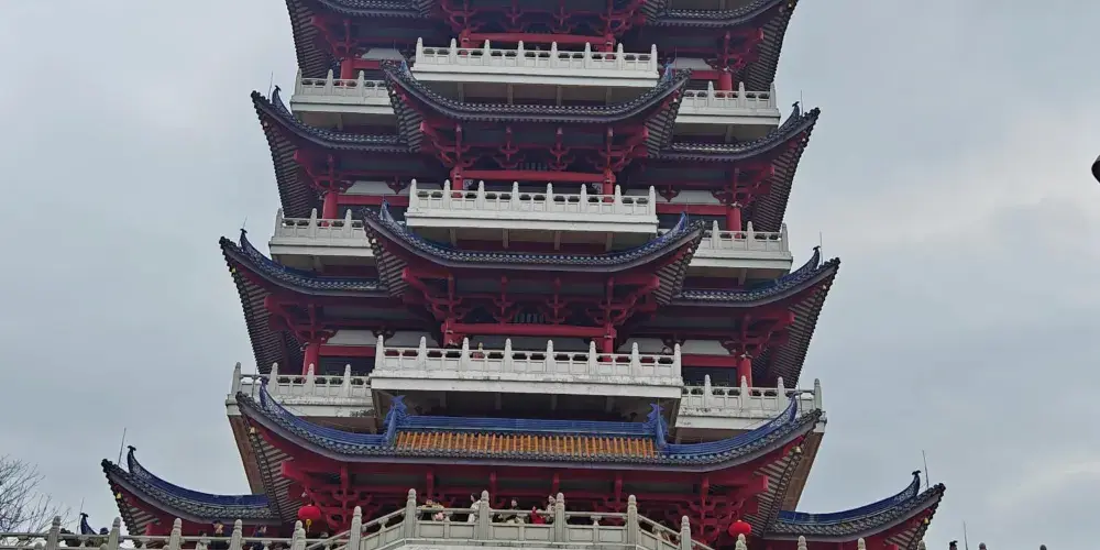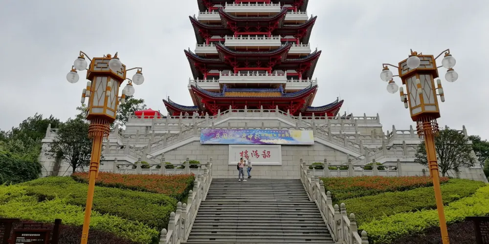 則評價韶陽樓建於韶關國家森林公園蓮花山頂峰。該樓座東南朝西北,從樓閣望市區或從市區眺樓閣均為極佳視角。該樓平面以“亞”字型上轉“十”字型構成,呼應蓮花山之意,形成聚心又主次分明的造型,加之每層漸次收分的簷柱,以及層層出挑的平座欄杆和起翹靈動的翼角,從而使人獲得莊重而不失豐富,大方而不乏靈氣的感受。韶陽樓共五層,高42.8米,五層取金木水火土五行之意,為中國傳統哲學構成世界精華元素之精蘊,寓意人們憑欄樓上,發思古之幽情,觀今朝之昌盛,暢未來之美景。