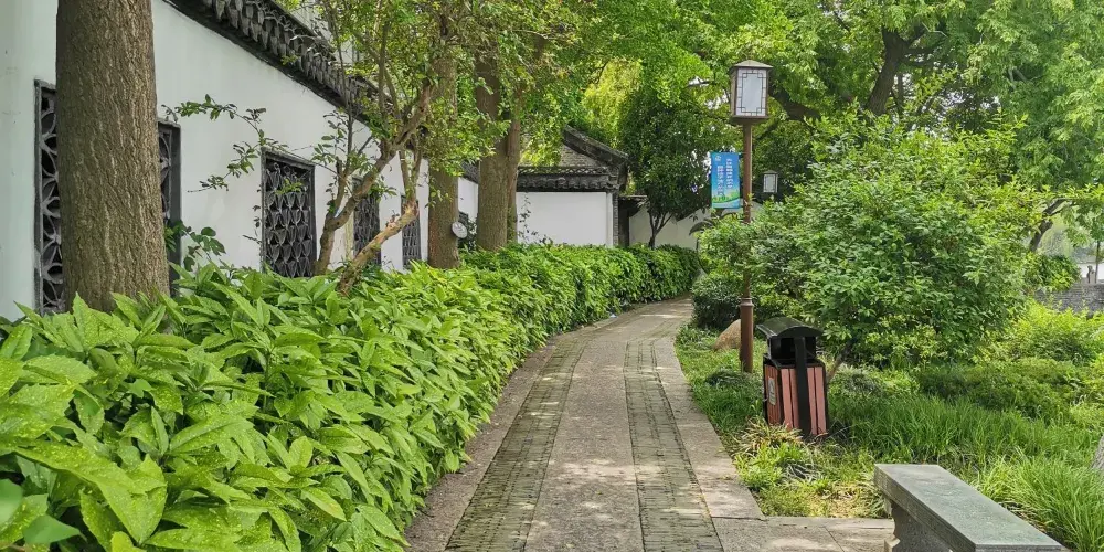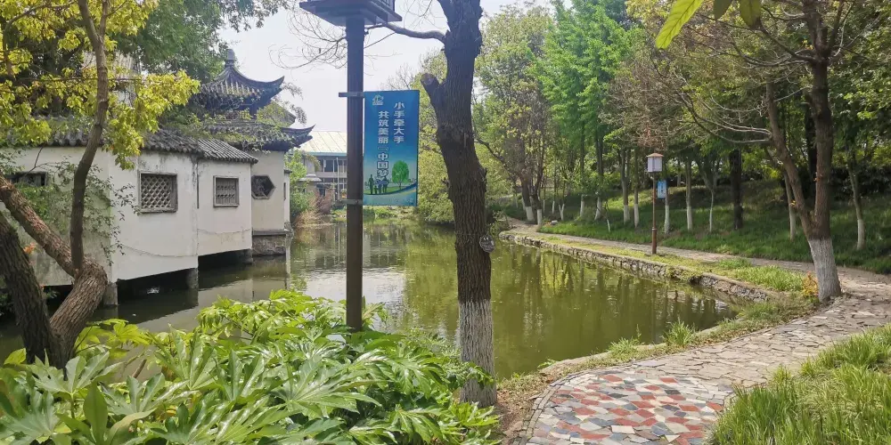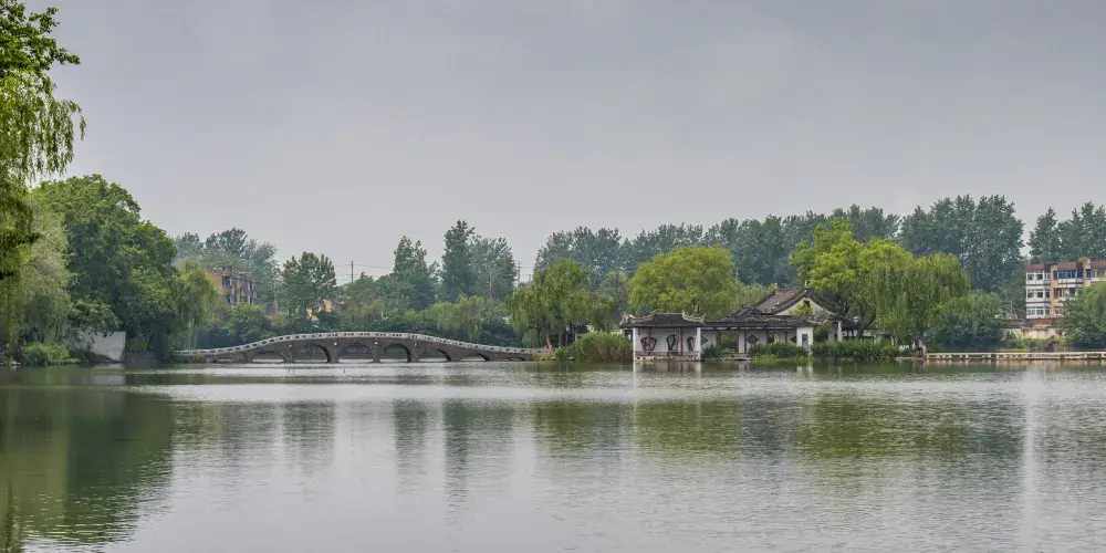 勺湖園,碧水、長橋、畫舫、亭閣、碑園、相映成輝,更有文通寶塔聳立湖畔,塔影、波光、鳥語給勺湖園平添了幾多文化的品位。勺湖因形似一把勺子而處名,擁有水面114畝,陸地40畝。這裏自古即為淮安名勝。據説從隋唐時代起,這裏建有著名寺院,來此遊歷或焚香膜拜者常年不絕。而這建勺湖公園。半個多世紀以前,當代一位偉人童年時曾在這裏留下足跡(注),來此觀賞的人們,每念及此,遊興陡增。當你踏進"文通塔苑"的門檻,首先撲入眼簾的是雙亭迴廊。過文通塔,即踏上勺堤,左側是綠波蕩漾的湖水,右為與淮中校園毗鄰的白身青檐的雲牆。由此向東北眺望,清晰可見遠處的兩道玲瓏別緻的洞門,令人的芳徑通幽之感。這雖然還比不上濃粧淡抹相宜的杭州西湖那麼美,但與江南一般園林相比,是毫不遜色的。過了兩道洞門,園中的一些古色古香的建築即呈現眼而這些建築,皆順着地形水勢,變代多樣,色彩柔和宜人,莊重而淡雅。湖心島上原大悲閣舊地,現建的一座廳堂,東側的貼水曲廊和扇形水榭,湖中建的石舫,舫上有兩層樓閣,登樓可鳥瞰全湖景色。湖心島南北有虹橋與陸地相連。明代進士阮葵生當年講學的勺湖書院也按明朝時候的建築風格修復好了,西側還增建一座春風亭,供探遊者休憩。在橋畔舉目平視,但見二三遊艇劃破水底藍天,其景別有一種情趣。