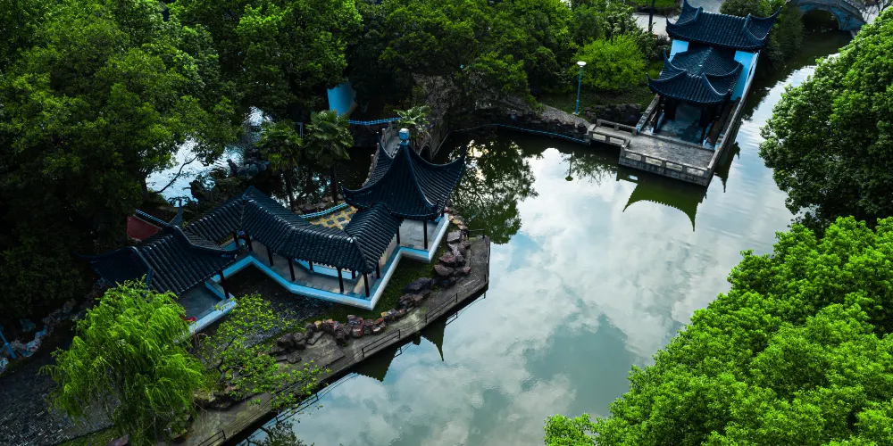 沙洲公園是一座構思精巧,佈局獨特,富有歷史文化底藴的江南仿古園林。公園內有牌坊、“滄江八景”浮雕、帶狀人工河、楓華園、黃石堆成的兩座假山以及石舫等,石舫艙上刻有“鑒真東航”四個金字,舫內置唐代高僧鑒真大師銅像。公園內別具特色的是微縮景觀“九寨溝”,常年流水潺潺;名木古樹有百餘個品種,其中不乏銀杏、杜仲、重陽木、五珍松、白皮松、金錢松、古櫸樹等。