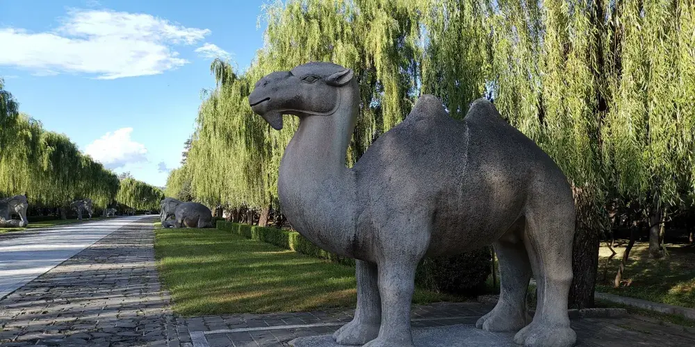 石像生位於從碑亭北的兩根六角形的石柱起,至龍鳳門止的千米神道兩旁,24隻石獸和12個石人整齊地排列着,造型生動,雕刻精細,為我國古代陵園中罕見的精美石雕,也是神路的一大看點。