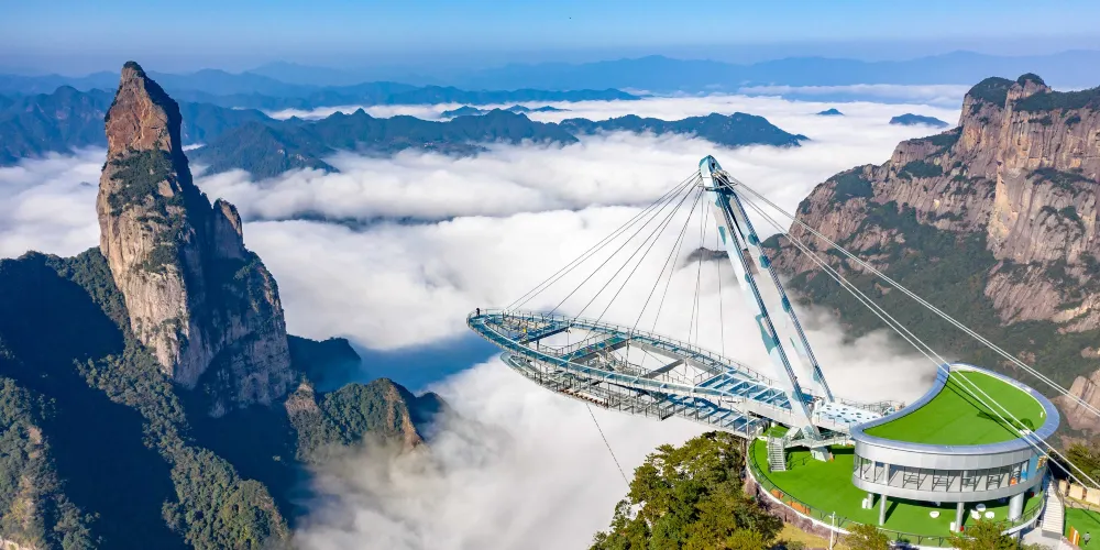 但凡看山景,必須是要爬山的,景區設定有索道,可以省去爬山的苦惱。 若不願爬山登嶺,也可以沿著曲曲彎彎的幽谷,踩著平坦如砥的山徑緩步而入,一路上便可飽覽十裏幽谷千重峭壁、萬丈懸崖的險峻,咀嚼到霧繞雲低、鳥唱蛙和的清幽。