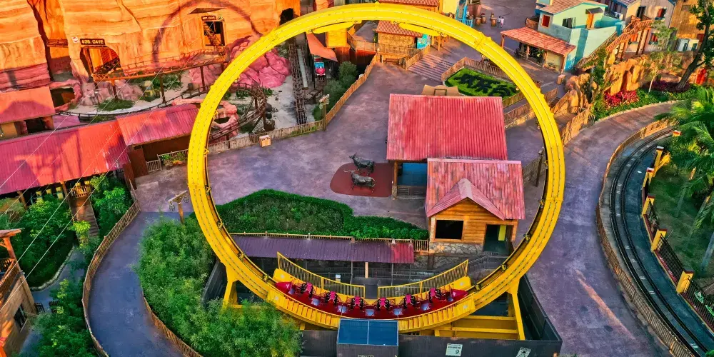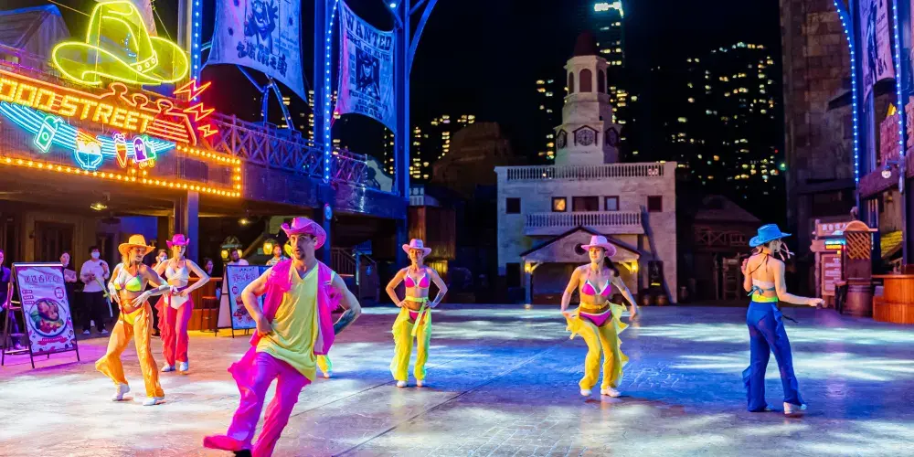 西部礦鎮:帶您走進西部世界,感受異域文化!既有驚險刺激的過山車和跳樓機,還有集夢幻光影、動感音效和互動參與於一體的炫彩演藝,帶您日夜狂歡!推薦項目:金濤駭浪、環翼飛車、恐怖塔、金礦漂流、金礦聽音室