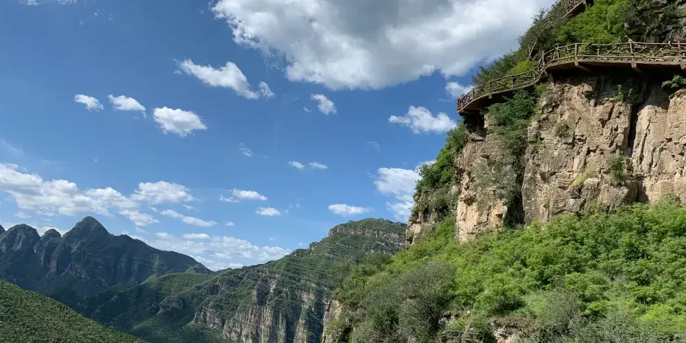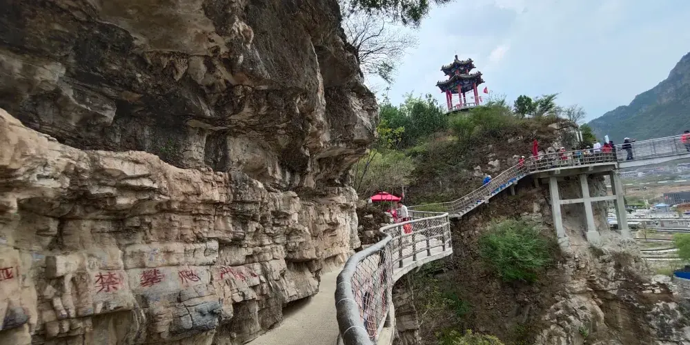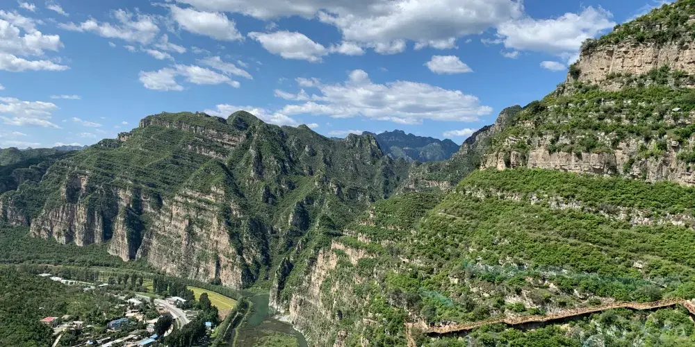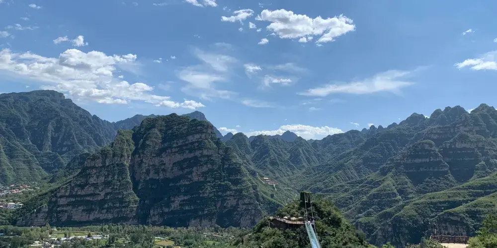 十渡誓言玻璃棧道建於鵲橋嶺之顛,透明的玻璃橋身讓你感受不一樣的激情與刺激。站在棧道之上,環視四周高山美景與懸崖峭壁。俯視下方,欣賞清澈的據馬河和壯麗的梯田景色。據說,單身男女走過此橋後,就能找到美好姻緣。具體是否如此神奇,只有你自己親自去體驗了才知道。