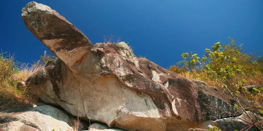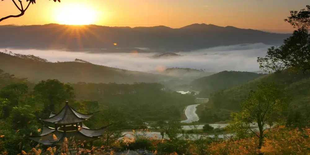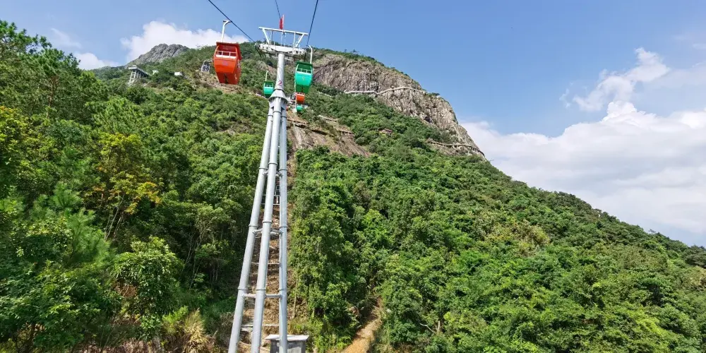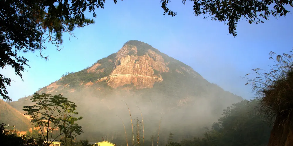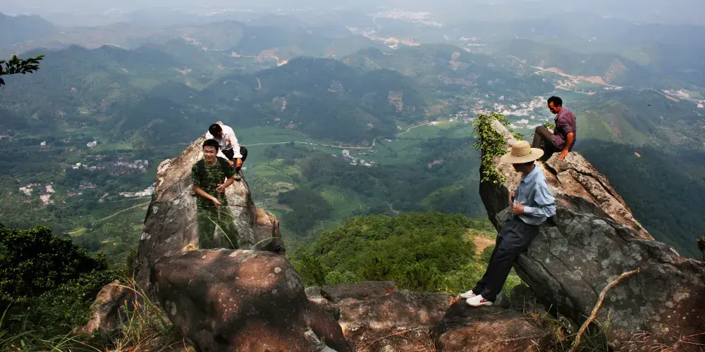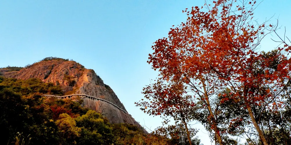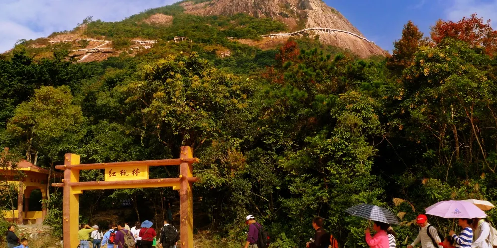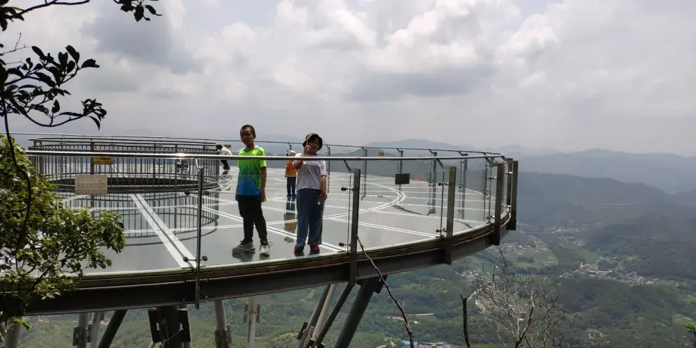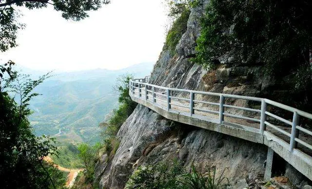 石根山位於廣東廣西交界處,在山腳仰望山體,尤如一根頂天石柱。山體海拔雖不算高,但登山道彎曲不平,風景奇秀。除了懸崖棧道之外,這裡的玻璃觀光平台也很有特色,它立於懸崖之上,又伸至懸崖之外,是非常好的觀景平台,若是下過雨天氣晴朗之後,雲海環繞在一起的景色更是讓人驚嘆。