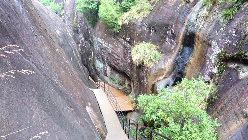 丹山、古樹、碧潭、綠水、幽谷、寺廟在石龍大峽谷景區完美結合,天人合一。剛進大門不遠就能乘坐景區的竹筏感受水上丹霞的絕美風光,一路往前奇特的丹霞地貌風光盡收眼底,古藤、奇石、野花隨處可見;還可以到景區內的洞天福地——萬壽閣祈福了願。是遊客觀光、尋幽、休閑、禮佛的好地方。