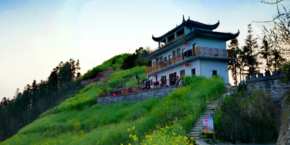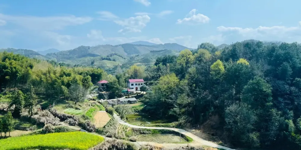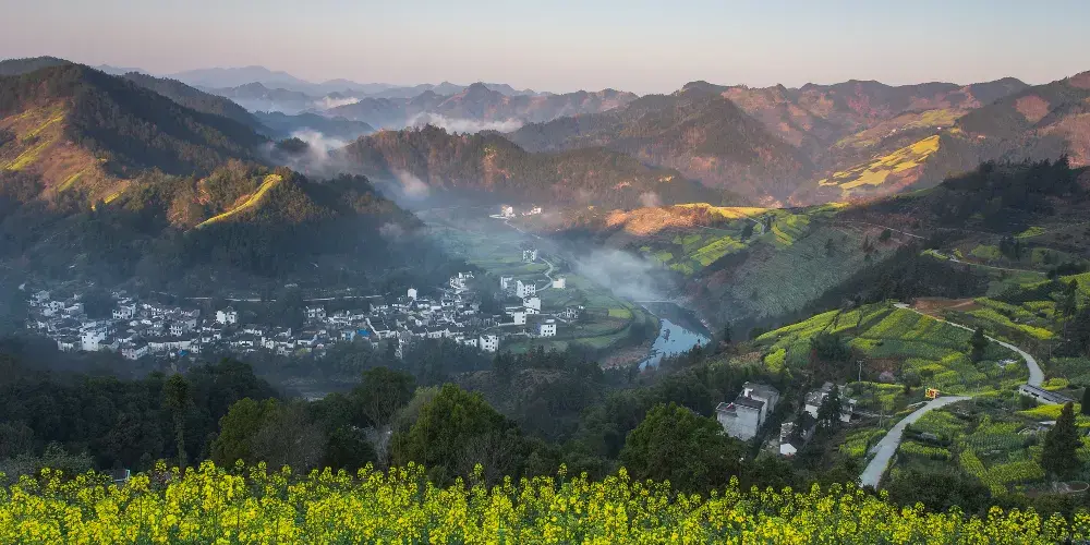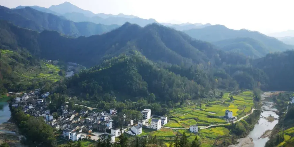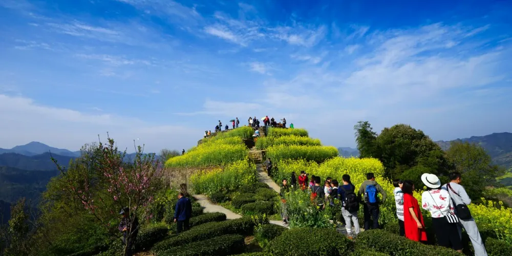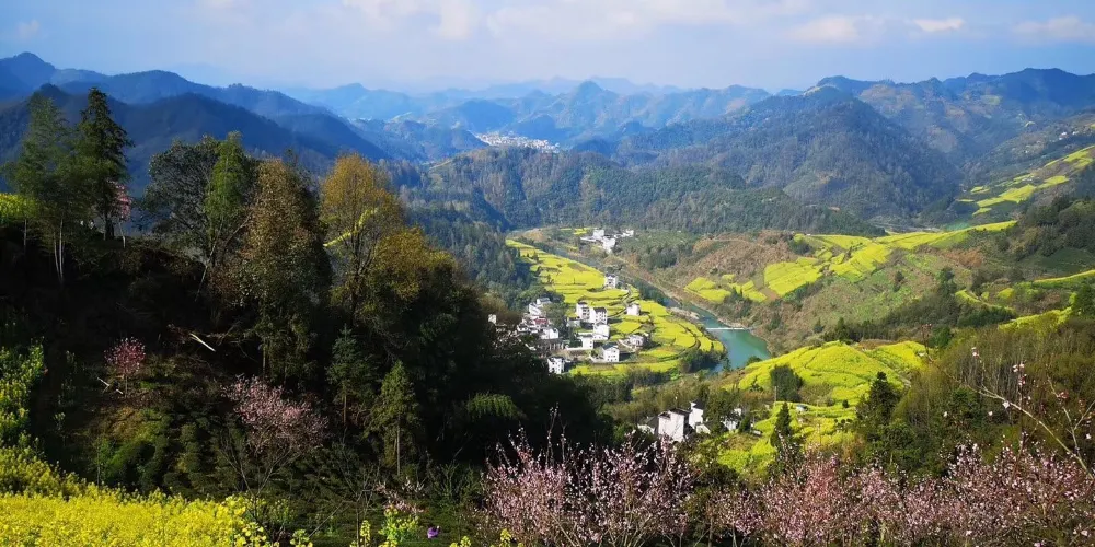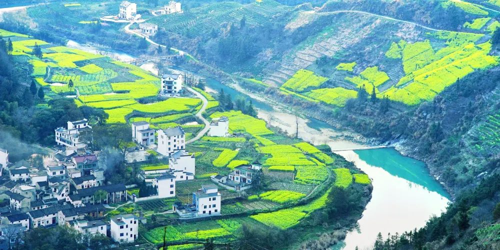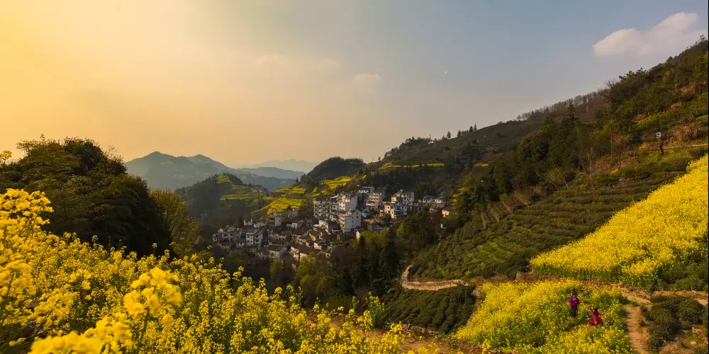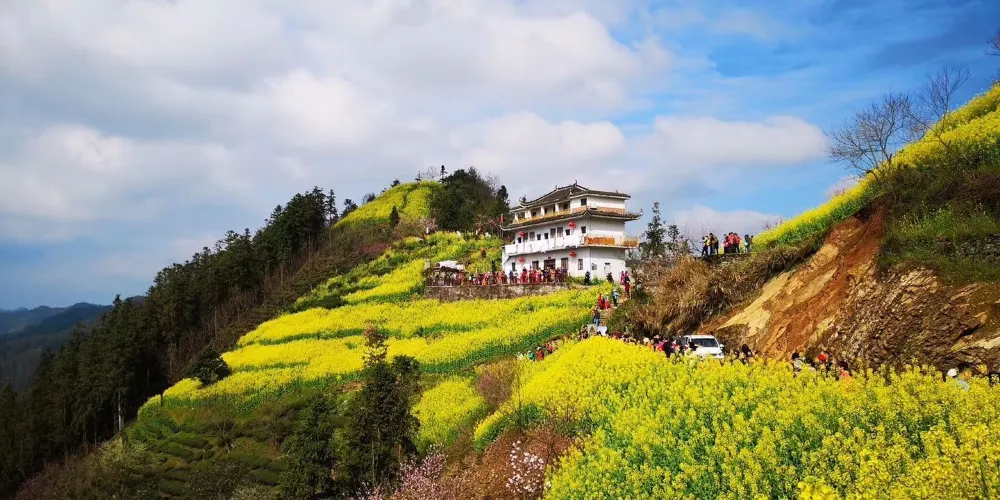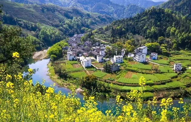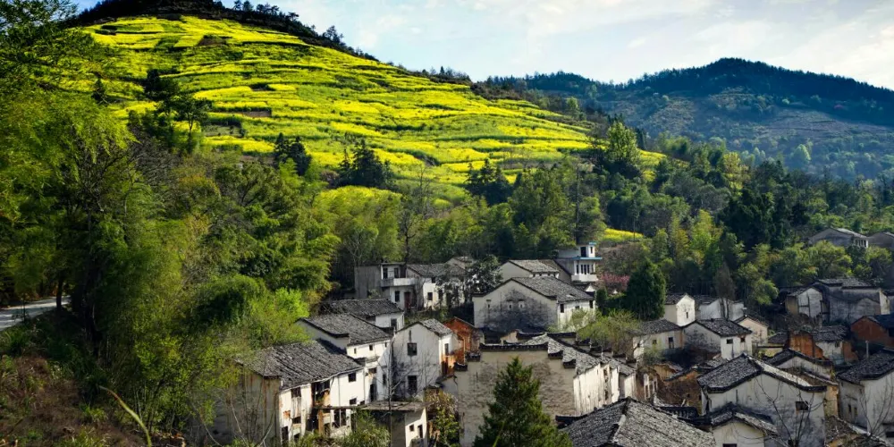 湖山村的房屋依山而建,都是灰瓦白牆的徽派建築風格,周圍盛開着大片的油菜花,美不勝收。