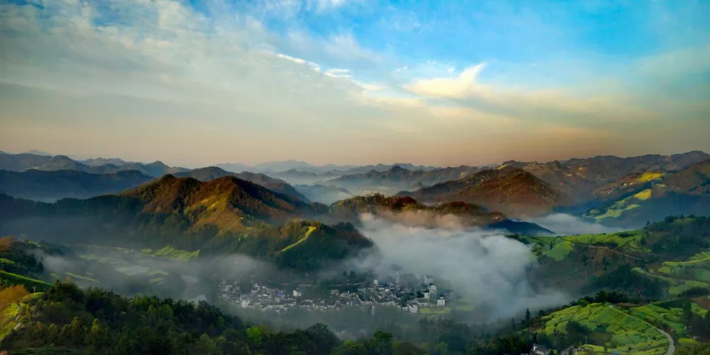 坡山村,以壯闊的雲海雲霧,配以春天的油菜花、夏天的向日葵、秋天的貢菊花、冬天的雪景、油茶花等,造就其大美風光遍全年,尤其是壯觀的雲海雲霧景緻奪人眼球,叫人謂為驚歎。坡山村因四面環山加之谷底的昌源河以及四季水分充足,形成獨特的地理小氣候,水蒸氣極易聚集,春季雷電極易催生出雲海,其景觀時而平靜如鏡,時而波濤翻滾,時而霧流一瀉千里;夏季雲海變幻更為波瀾壯闊;秋季雲曦如仙境,彩霞如扯出的碎紅綢帶;冬季雲霧繚繞,氣勢壯觀,有“早霧日頭曬煞頭”的俗語。“村在雲霧中,雲霧在村中。”是對坡山的真實寫照。