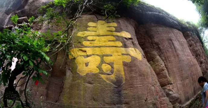 這是一處摩崖石刻,山崖上刻有一個巨大的壽字,站在山頂可以俯瞰山下的風景。