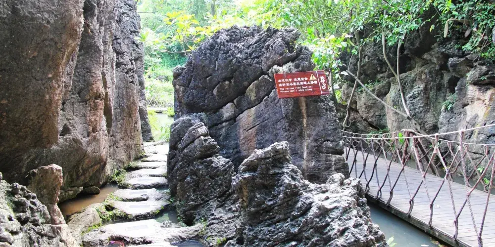 黃果樹瀑布景區-水簾洞位於黃果樹景區四十米至四十七米的高度上,全長一百三十四米,黃果樹瀑布景區-水簾洞由六個洞窗、五個洞廳、三股洞泉和六個通道組成,主要景點有:倒掛仙人掌、古球懸根、藤簾、榕風花園、鼓風口、摸球花園、鼓風口、樂球花園等。穿越黃果樹瀑布景區-水簾洞,還有一個絕妙奇景,從各個洞窗中觀賞到黃果樹瀑佈景區-犀牛潭上的彩虹,這裡的彩虹不僅是七彩俱全的雙道而且是動態的,只要天晴,從上午九時至下午五時,都能看到,並隨你的走動而變化和移動。前人:"天空之虹以蒼天作襯,犀牛潭之虹以雪白之瀑布襯之",故題"雪映川霞"。
