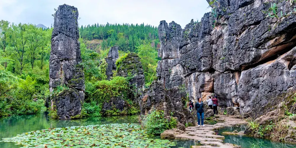 銀鏈墜潭瀑布,位於貴州安順黃果樹瀑布下遊,傳說中的“龍犀相摶”的地方——三岔河下面的河咀瀨伏流入口處,屬於落水洞型瀑布。銀鏈墜潭瀑布位於天星橋景區水上石林區的,其形如鬥,其聲如歌,其狀如鏈。在黃果樹瀑布群中,它既不是以高取勝,也不是以闊或大驚人,而是以它那千絲萬縷的情態和如泣如訴的瀑聲,讓人看見就不想離開。