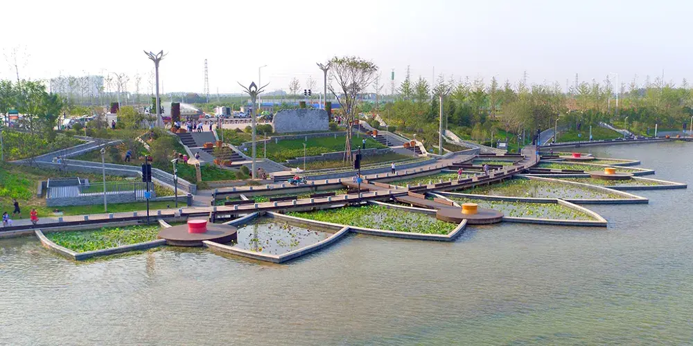 雙鶴湖中央公園位於鄭州市航空港經濟綜合實驗區南部,是第十一屆國際園林博覽會的重要組成部分。雙鶴湖的命名源自河南新鄭“鄭公大墓”出土的春秋中期青銅水器——蓮鶴方壺。園區的整體構造以此為主,細節設計更是突出“鶴”這一設計理念。園中橋樑以鶴舞仙姿為設計理念,步道台階、燈柱雕畫鶴之姿,“鶴”無處不在。雙鶴湖中央公園整體功能佈局為“一軸兩帶、三區多元”。【一軸兩帶】一軸:暨繽紛博覽軸,也是觀景主軸,通過特色節點串聯,形成一條虛實結合、古今輝映的城市人文軸線。主要景點為星鶴塬、萬花筒兩大建築,其中星鶴塬上的觀景台——伴月台為園區制高點,可一覽全貌。兩帶:北側智慧觀光帶:以科技創新、先鋒園藝為亮點。主要景點有歲時庭、草葯園、瓷器園、花香園等。南側休閑體驗帶:以認知體驗,互動參與為特色。主要景點有文庭園、農耕園、五穀園、稻香園等。【三區多元】歡樂島:以水域觀光為主,水與城的肌理,詮釋着城市與水的相互依存。區域亮點為“鶴之靈”大型音樂噴泉秀,不可錯過。探索島:展現中原科技,園與丘的肌理,向人們介紹着特色的丘陵土塬。區域亮點為以“海綿城市”理念打造的大型四層覆土建築星鶴塬。鮮花港:聚焦園藝與農業景觀,花與田的肌理,在視覺上模擬曠野的阡陌縱橫。區域亮點為以植物為特色的花香園和稻香園。