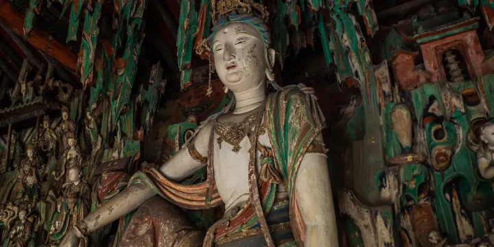 雙林寺是與平遙古城牆、鎮國寺等景點一同列入《世界遺產名錄》的古寺,寺內比較珍貴的是全部由木胎泥塑而成的雕塑,集宋、元、明、清歷代彩塑之精華。菩薩殿的千手觀音藝術水平很高,她端坐於滿壁青綠的背景之前,儀容端莊而典雅,神態溫柔而又安祥。每支胳膊塑造得圓潤豐滿,跟身體的比例恰到好處,毫無生硬、造作之感,達到雕塑藝術中和諧、完美的境界。