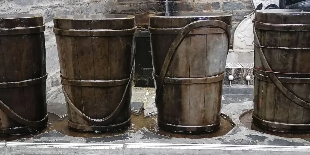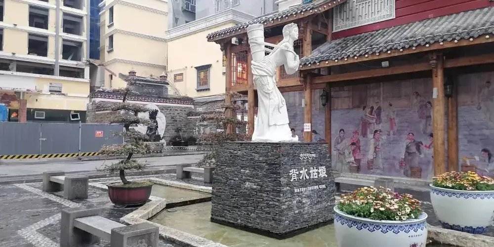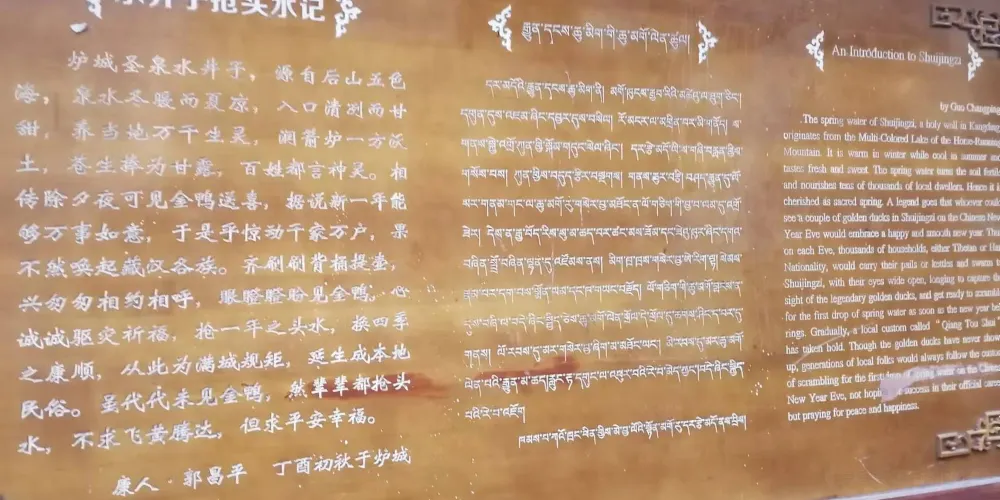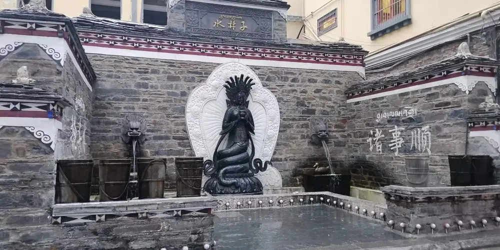 水井子位於跑馬山下,康定城內,其泉水源於五色海,泉水清澈見底,寒冬時節,泉水也不結冰,熱氣騰騰。水井子景點設計巧妙,古色古香,富有濃郁的民族特色,懸空樓閣、飛檐琉璃、巴書、雀躍,均彩繪藏民族傳統圖案。正對大門牆上刻有“水井子”三個藏漢文大字,閣下左右兩溝之間砌有背水台和精巧玲瓏的藏式白色薰煙塔,塑有藍色裝飾浮雕。大門兩側牆上給有吉祥八寶、海螺圖案。進門右牆上鑲嵌着用藏、漢、英三種文字撰寫的《水井子記》漢白玉石刻橫碑,其碑長4米、寬1.5米,左牆上一幅大型石刻畫,用虛實交錯的手法,把《水井子記》全文內容形象地繪於其上,引人入勝。三方牆頭均採用藏族傳統建築裝飾巴書,上有藍天白支,充滿《康定情歌》的神韻。整體色調以土紅色為基調,色彩層次分,絢麗多彩,自然景觀和人文景觀融為一體,交相輝映。"水井子"標識臨街而築,石座上背女婦女雕塑栩栩如生,遊人都要在這裏住腳留影,成為必到的景點。