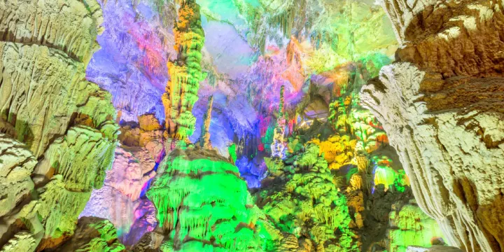 舜皇巖景區位於舜皇山國家森林公園駐地大廟口鎮,距東安縣城29公里。因舜帝南巡狩獵駐驊舜皇山而得名。江南風光好,舜巖美景多。舜皇巖相傳是舜皇的地下別宮,人稱神祕之境。它位於東安縣舜皇山東麓,大廟口八旗田洞中的一座獨立的大石山內,相傳舜帝晚年南巡至東安,見該地重變疊嶂,青秀挺拔,流水明凈,田園如畫,被吸引進山巡視和狩獵,便在此高的山峯定居下來,因而該山得名曰舜皇山。《史記五帝本》記:“江南有十峯,而舜峯高矣”。湖南省《一統志》永州府《文藝志》載:“永之東安有舜峯、玉陛源、皆祀有虞氏,東安近九嶷,因舜南巡狩所經也”。舜旅居舜皇山期間,經常下山視察民情,為方便起見,特修建了這座地下別宮。舜皇巖是一處典型的喀斯特溶巖地貌。據考古學者認定,巖洞的形成已有一億多年的歷史,1982年發現後逐步開發成現在的規模。巖洞長760米,總面積約18000平方米,由外向內分為前宮、中宮、後宮和側宮,形成洞中有宮,宮中有殿,移步換形,步步有景。由鐘乳石發育而成,石筍、石柱、石幔、石瀑布、仙人橋、仙人田、蓮花塔等構成一幅幅精美的天然雕塑,宛如一個璀璨奪目的地下迷宮。洞內四季如春,夏無溽暑之苦,冬無寒冷之虞,是“脈邊地府三冬暖,巧引天光六月寒”的洞天世界,被譽為“舜皇別宮”。巖洞內的景點幾乎包攬了《洞穴學》的全部內容,成為全國石灰巖洞的一朵奇葩。