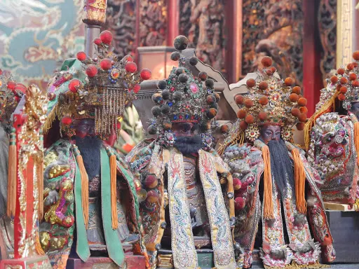 由正殿大門朝裡望,透過逐次升高的天井和房舍狹長的空間可以遙見那香煙繚繞、金黃帷幕下的全身媽祖神像。媽祖慈眉善目,神態安詳。據說媽祖原來是粉紅面,但經百年來受香火的薰繞,現在看到的媽祖已成了黑色的“香煙面”了。這座神像是約300年前一位泉州師傅所做,可說是台灣泥塑雕像的代表之一。媽祖神像兩邊的神龕裡還供奉著東、西、南、北四海龍王和水仙尊王。