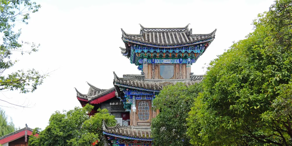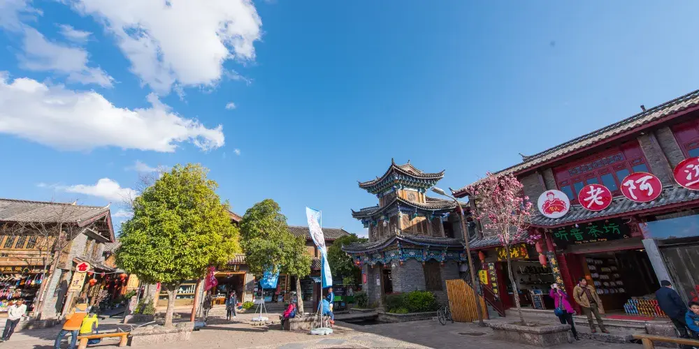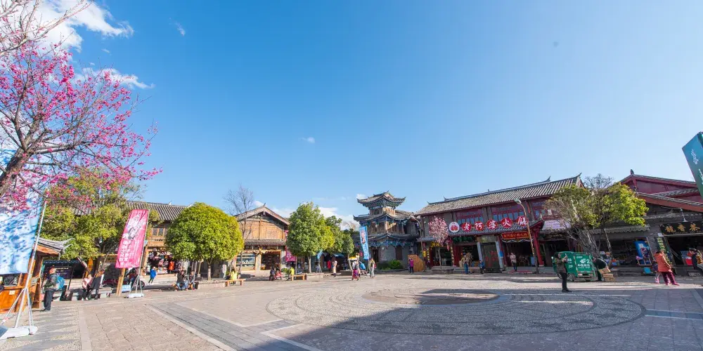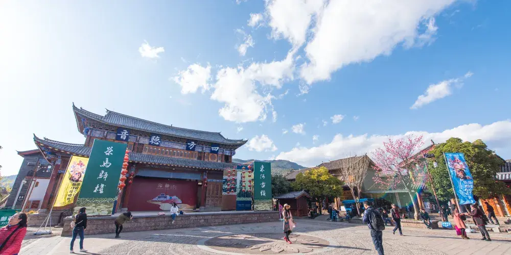 四方聽音廣場在束河古鎮的南面,門樓上的“四方聽音”四個字很大;“四方”兩字是雙關語,既引自於“四方街”,又是實意,四面八方、廣納百川。