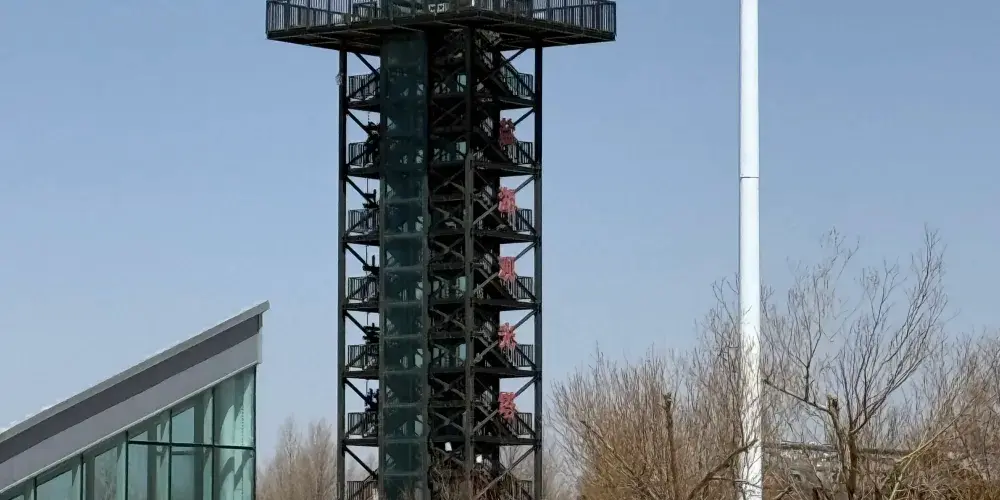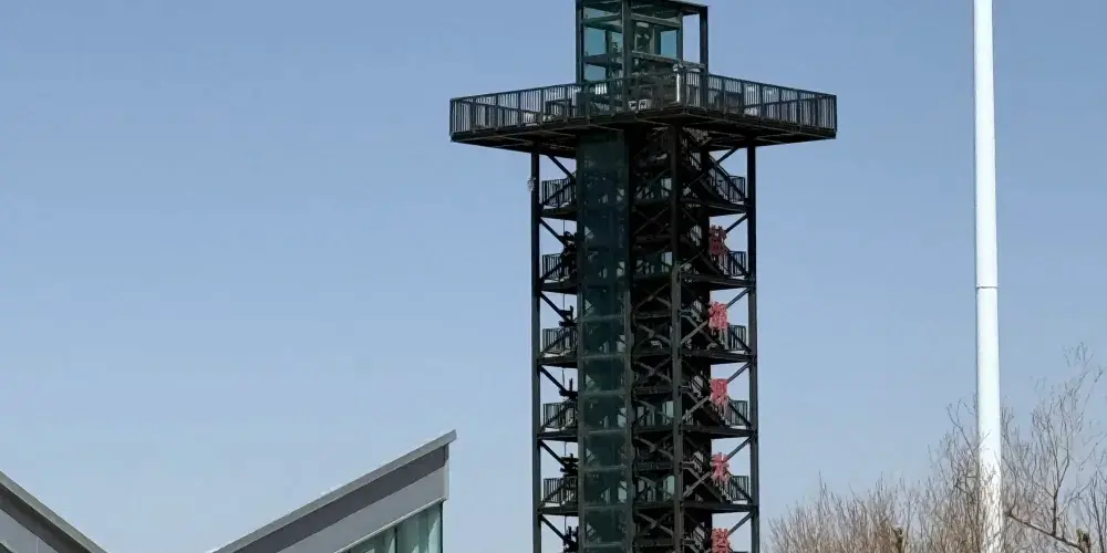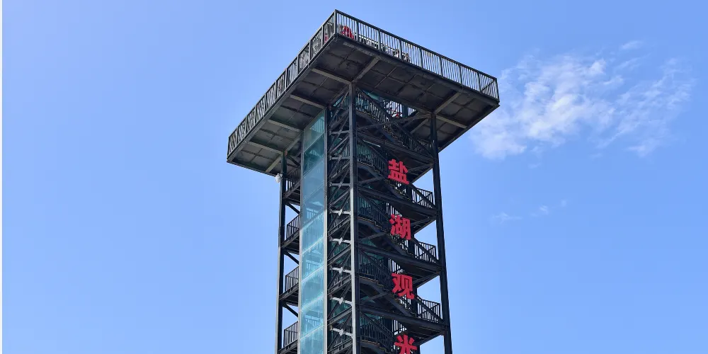 觀光塔佔地約125平方米,高約28米,由兩部鋼結構樓梯及一部觀光電梯組成,頂部露天觀景平台能同時容納近百人觀光。極目遠眺,鹽湖宛如一面巨大的鏡子,倒映著澄澈天空與連綿山巒,水天相接,壯美非凡。潔白的鹽灘在日光下閃耀,觀光小火車沿著鐵軌緩緩駛向鹽湖深處,為畫面增添靈動之美。天氣晴好時,甚至能望見遠處皚皚雪山的倩影。攝影者可利用固定支架捕捉""天空之鏡""的瞬息之美,記錄鹽結晶與光影交織的魔幻時刻。茶卡鹽湖景區-觀光塔採用開敞結構設計,為遊客提供良好的景觀視野,塔頂是個大露台,站在平台上可將茶卡鹽湖景區美景盡收眼底。