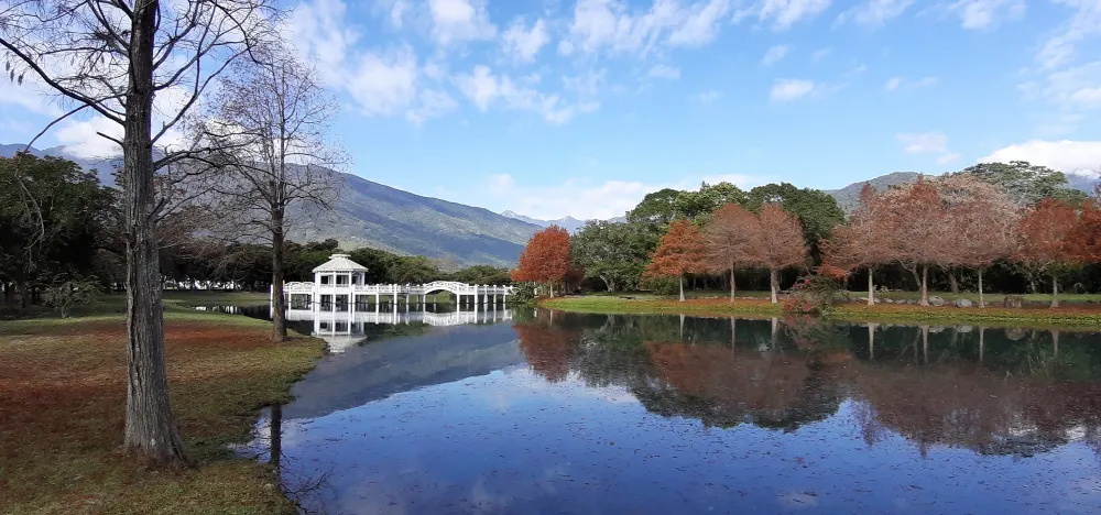 湖畔設有瀑布造景,遍植落羽松及各式樹木,結合大片療癒的綠草地,成為受歡迎的打卡景點。湖上的白色情人橋,可以讓遊客站在橋上遠眺氣勢雄偉的中央山脈,看著山腰雲霧繚繞,構成一幅動人山水畫。湖面周遭的樹木及自然生態,吸引許多候鳥、野鴨停駐,也是觀賞野鳥生態的絕佳景點。