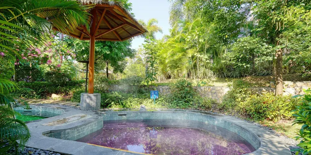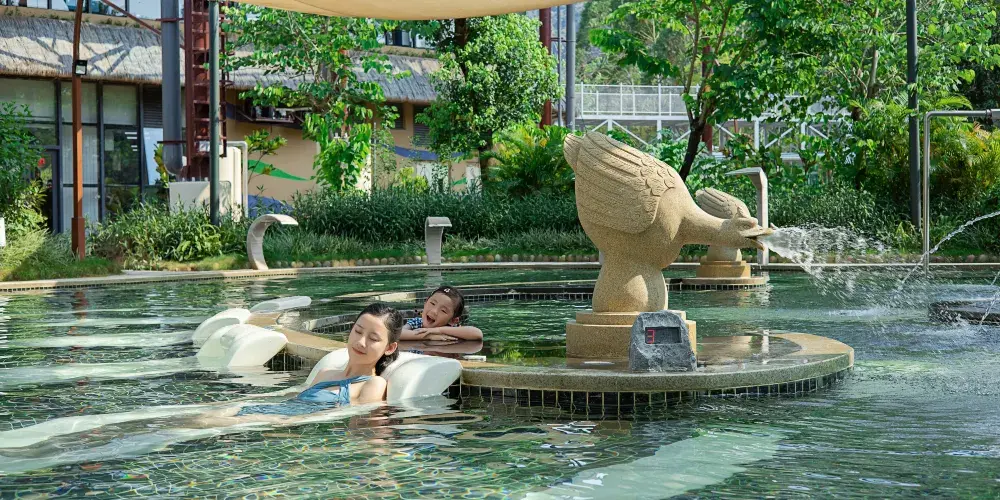 【森林溫泉區】:擁有室內室外總共48個具有網紅特色及功能的溫泉泡池,包括空中鳥巢溫泉、繽紛溫泉、動感理療溫泉等溫泉泡池,另設有溫泉SPA、石板浴、游泳池、桑拿房等區域。玩累了可以在此處泡泡溫泉舒緩身心。