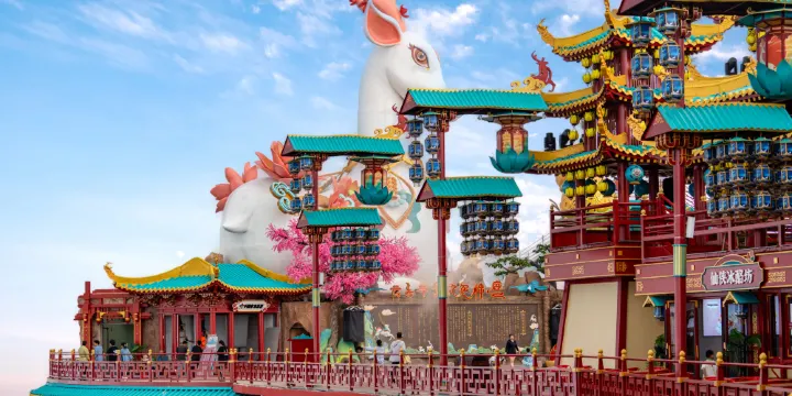 雲上草原仙俠鎮位於浙江省安吉縣雲上草原國際山地旅遊度假區內,坐落於海拔1168山巔之上,以雲海仙市、高山遊藝、沉浸互動、夢幻夜遊、國風Trip Moments為筆墨,以山巒雲海為畫布,講述了「見鹿者得福報、守青山即修仙」的故事。遊客在仙俠鎮可沉浸體驗到奇幻玄妙的仙俠幻境、暢遊國風國潮的雲海仙市、打卡牧雲入霧的仙風場景,玩轉真人NPC仙界闖關,挑戰豐富多彩的遊樂項目。仙俠鎮與雲上草原四季美景交相呼應,進一步展現了「綠水青山就是金山銀山」的美麗畫卷。