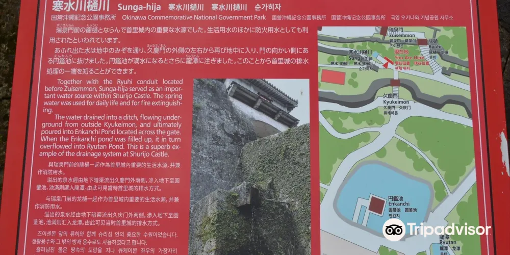 這座琉球式古堡結合了中國、日本及沖繩島的建築特色,有多座城門,入口處不遠就是守禮門,門上題有「守禮之邦」的牌匾是中國皇帝冊封琉球國王時所賜。而後經過歡會門、漏刻門、奉神門等就到了城內較大的建築物——正殿。正殿的南北大廳於 2019 年 10 月 31 日被大火燒毀,目前正在準備修復。