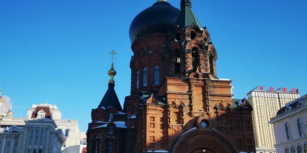 索菲亞廣場位於松花江南岸,廣場由猶太新會堂、聖·索菲亞教堂和建築藝術廣場三部分組成。聖·索菲亞教堂是哈爾濱非常有名的地標。它是一座典型的拜占庭式建築,內部的壁畫、吊燈、鐘樓及穹頂和唱詩台顯示著豐富的人文景觀和鮮明的藝術特色。