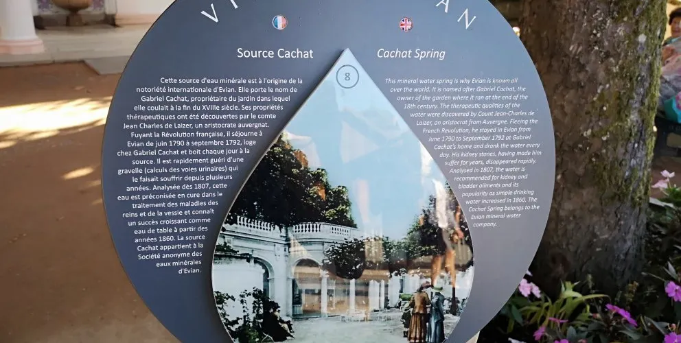 這裡是依雲小鎮是可以取礦泉水的水源之一。水源來自阿爾卑斯山的高山融雪和山地雨水,可以直接灌裝了喝。1789年法國貴族MarquisdeLessert較早在Cachat花園發現了依雲礦泉水對身體的益處,從此依雲礦泉水聞名起來。依雲鎮也真是個鳥語花香、空氣清新、悠閑自在好去處。