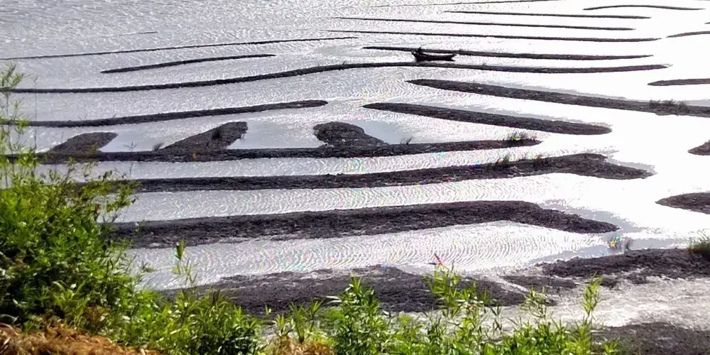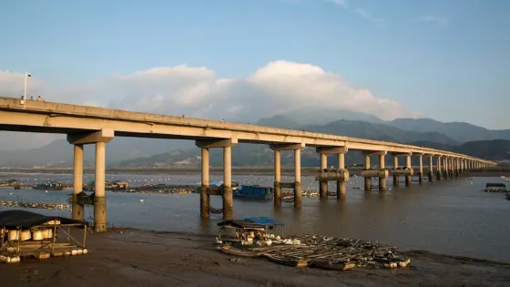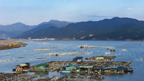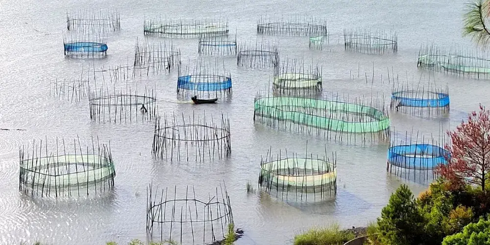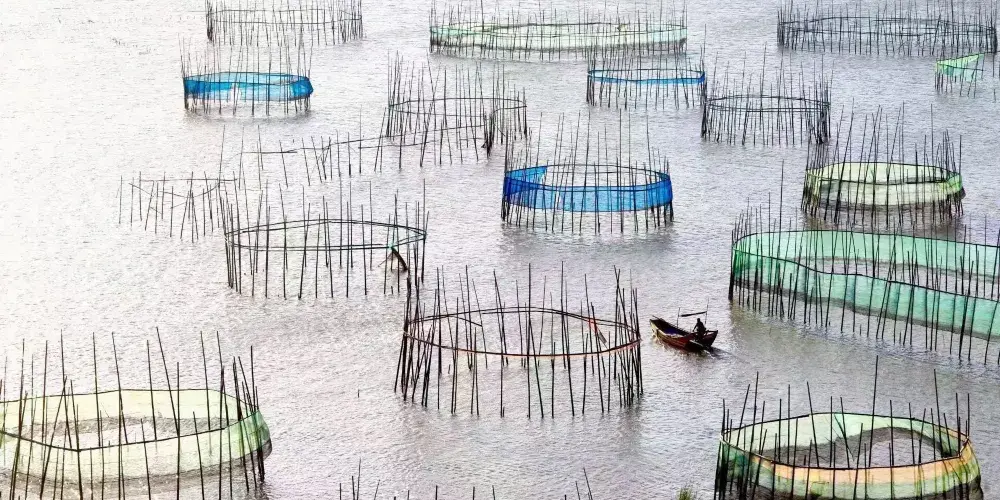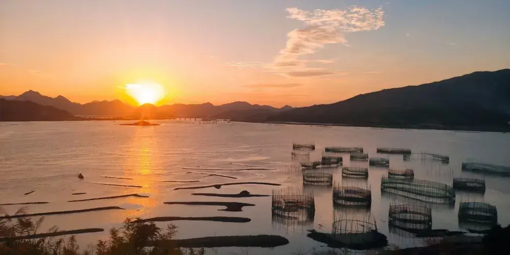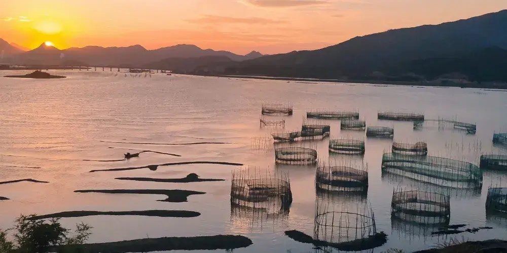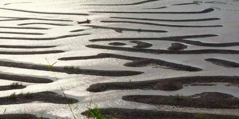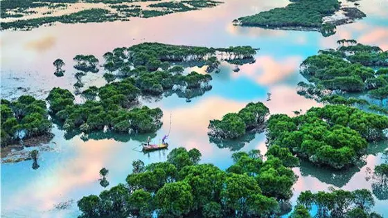 在鹽田鵝灣村附近的灘涂有一片小小的紅樹林,隨著潮起潮落,或露出灘涂或與海水渾然一體,再加上鮮豔的小漁船點綴其中,給霞浦帶來另一番風情。樹林把灘涂又隔成了一條條蜿蜒曲折的水道,小船行駛在這天然植物組成的水道上,構成了一幅美妙絕倫的圖案。