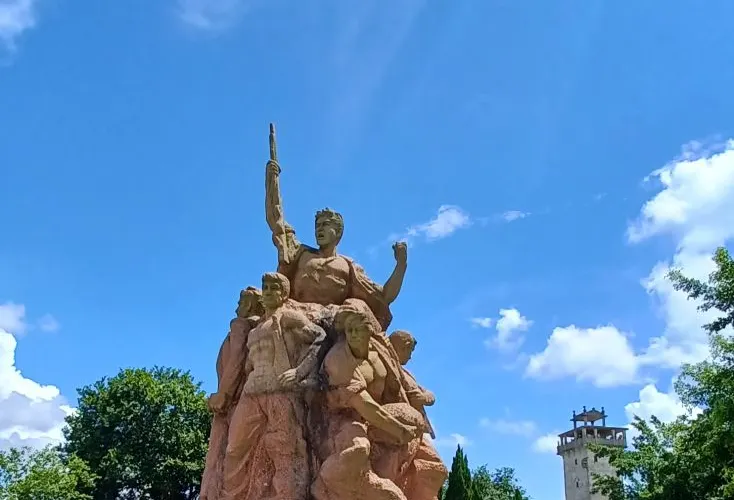 南樓,位於開平市赤坎鎮騰蛟村,南臨潭江,北靠東滘龍公路,扼三埠至赤坎水陸交通之要沖,地勢險要。1912年,司徒氏人為防盜賊而建此樓。南樓樓高7層19米,佔地面積29平方米,鋼筋混凝土結構,每層設有長方形槍眼。1945年7月16日,日寇投降前夕,為了打通南路幹線以便撤退,從三埠分兵三路直撲赤坎鎮,司徒氏四鄉自衞隊的勇士們憑據南樓抗擊日軍,給敵人以沉重打擊。17日赤坎淪陷。是日晚,日軍從陸路包圍南樓。由於敵我力量懸殊,又無援軍,自衞隊部分隊員在激戰中突圍出去,留下司徒煦、司徒旋、司徒遇、司徒昌、司徒耀、司徒濃、司徒炳等7名隊員堅守南樓,戰鬥7天7夜,重創日軍。抗戰勝利後,開平人民在開平一中召開追悼會,開、恩、台、新四邑參加者3萬多人。追悼會上泣聲動地,人們列隊護靈至騰蛟廟,將烈士的靈位安放在三靈宮,並將三靈宮易名為“七烈祠”,足見烈士的英勇事蹟深入人心。1999年3月,開平市籌資300多萬元,在原址與建南樓紀念公園,增設紀念館、雕像、牌樓等景緻,把它建成風景迷人的旅遊景點和愛國主義教育基地。