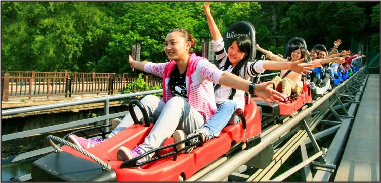 南溫泉索滑道起點始於建文峰山頂,終點在南溫泉廣場東面。整個滑道建設採用德國技術由德國威鋼公司設計並全程安裝,採用管軌式,滑行很有刺激性而且更加安全可靠,滑車車體和軌道的完美結合解決了滑行過程中產生的晃動,給遊客完美順暢的滑行體驗。
