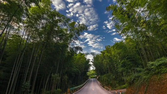 蜀南竹海風景名勝區-翡翠長廊的路面是由「色如渥丹、燦若明霞」的當地天然的紅砂石鋪成。兩旁密集的老竹新篁拱列,遮天蔽日,紅色地毯式的公路與綠色屏封的楠竹交相輝映,加之這裡的道路時起時伏,頂上兩旁的修竹爭向內傾,幾乎拱合,長廊就更加顯得幽深秀麗,從而成為蜀南竹海具特色的標誌性景觀。