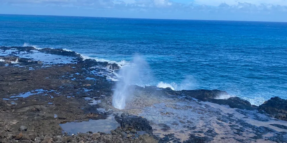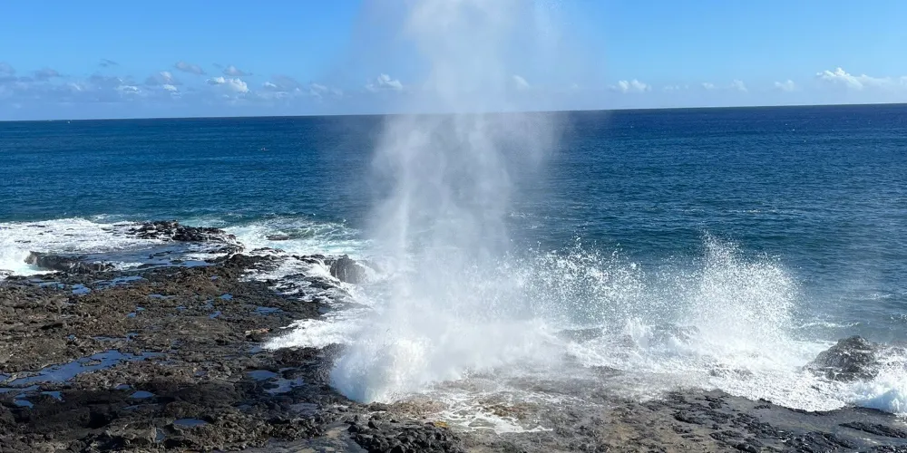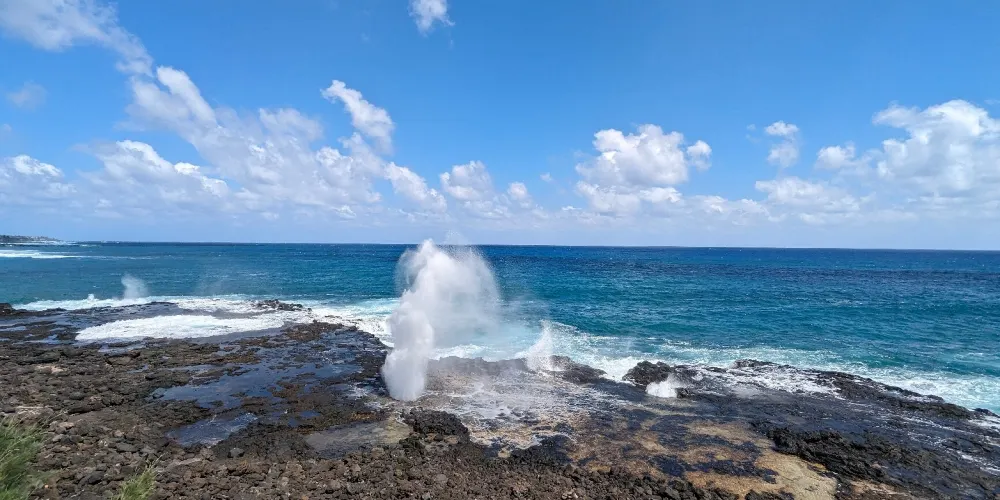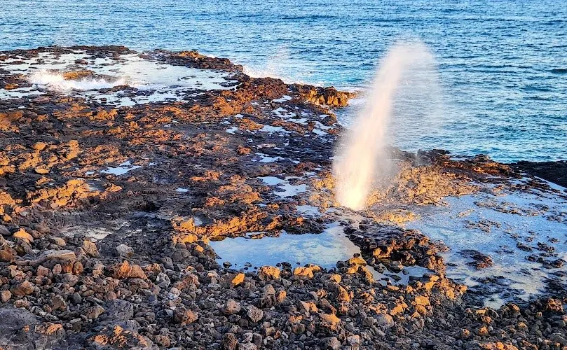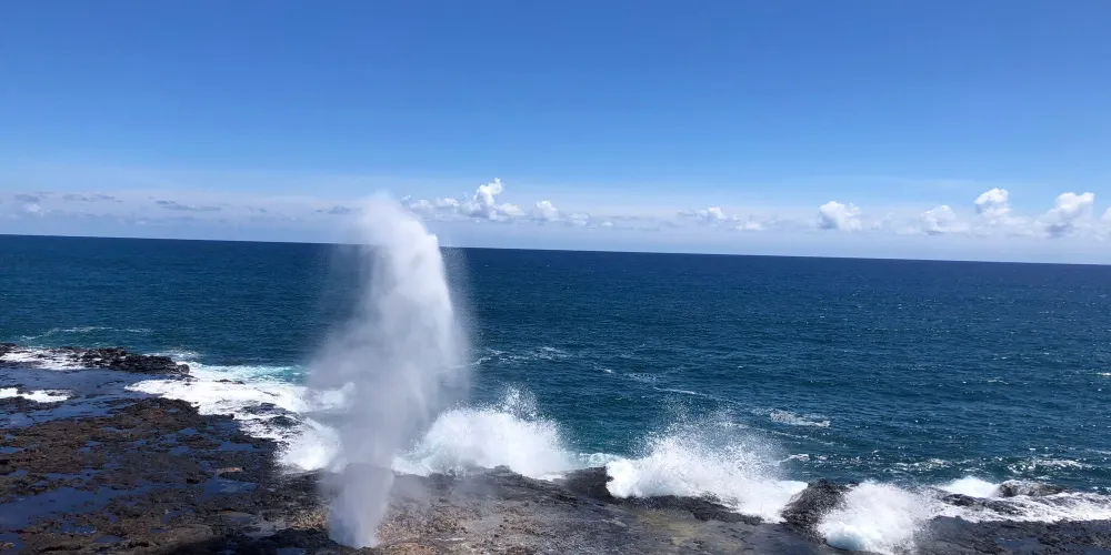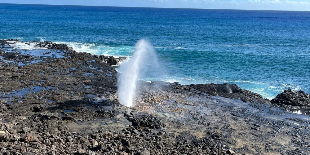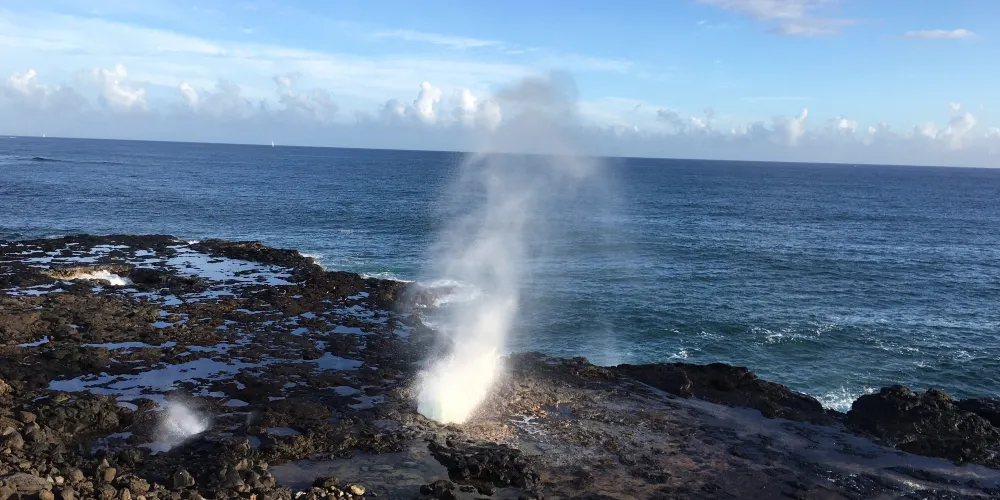 號角噴泉位於美國夏威夷州可愛島南海岸的波普(Poipu)海灘,一直是可愛島熱門的景點。火山噴發流出的熔漿在海邊冷卻後,形成了海灘沿岸的礁石,礁石上留有天然的石洞,海浪拍打時會從石洞中噴出高高的水柱,從而形成了天然噴泉,噴泉噴發時會發出類似於噓聲和怒吼聲的聲音,因此便有了號角噴泉的名字。這裏不僅可以看到自然噴泉這樣的奇觀,還是欣賞日落的好地點。