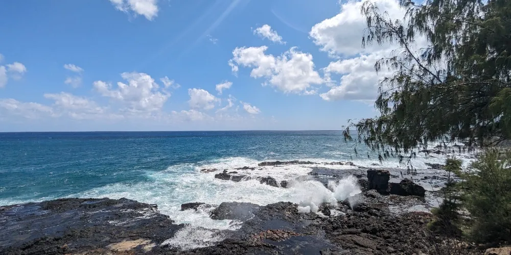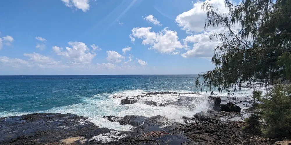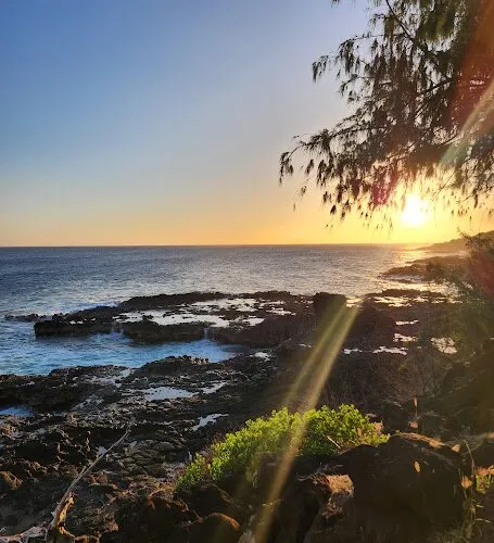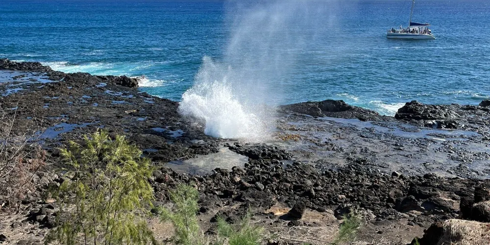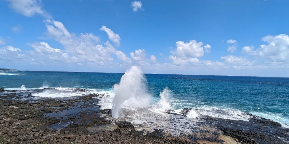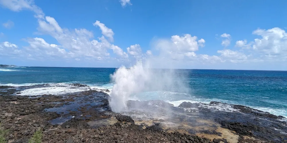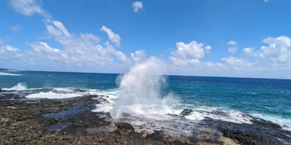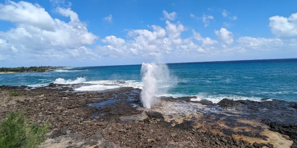 號角噴泉位於美國夏威夷州可愛島南海岸的波普(Poipu)海灘,一直是可愛島熱門的景點。火山噴發流出的熔漿在海邊冷卻後,形成了海灘沿岸的礁石,礁石上留有天然的石洞,海浪拍打時會從石洞中噴出高高的水柱,從而形成了天然噴泉,噴泉噴發時會發出類似於噓聲和怒吼聲的聲音,因此便有了號角噴泉的名字。這裏不僅可以看到自然噴泉這樣的奇觀,還是欣賞日落的好地點。