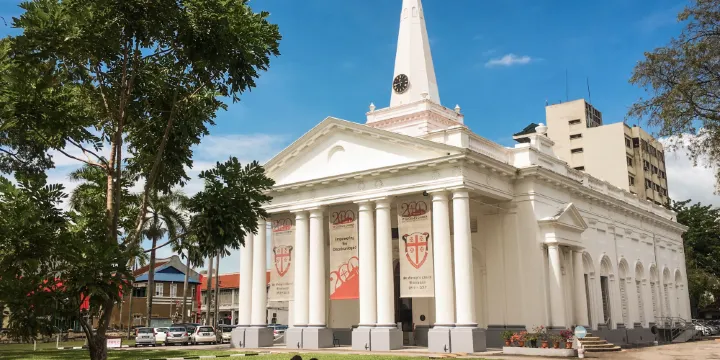 聖喬治教堂是東南亞古老的英國聖公會教堂,是當地古老的名勝之一。這座建築比例相當勻稱,地面由大理石鋪就,有排列整齊而且造型美觀的圓柱,尖頂高高聳立。教堂的庭院中還有一座別緻的小閣樓,裡面存放著倚靠幾年弗朗西斯·萊特船長的銘碑。