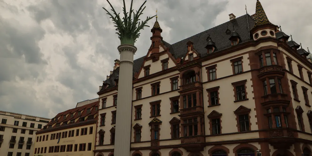 則評價較早建於1556年,二次世界大戰中被毀,現存者為戰後重建。內部現為萊比錫歷史博物館對公眾開放。它共分三層,下面是棕紅色石材砌築的拱廊,中間為簡潔的黃色牆身,上面是紅瓦斜坡屋頂。屋頂上還建有6座造型優美的高閣樓,閣樓中間高聳的鐘塔是廣場的中心標誌。這棟大樓以其優美的外觀而成為德國漂亮的文藝復興建築之一。博物館內除陳列着被戰火燒壞的教會聖像、1823年的城市模型等資料及遺跡外,樓上還有特別展室。入口在二樓下面的棕紅色石材砌築的拱廊有一些商店,出售紀念品和香煙。舊市政廳後面是集市廣場,廣場上有年輕時代的歌德塑像。