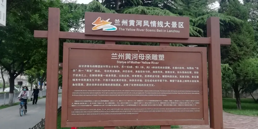 黃河母親雕塑位於蘭州黃河南岸的濱河路中段,由雕塑家何鄂女士創作。黃河母親雕塑由“母親”和“男嬰”組成構圖,分別像徵了哺育中華民族生生不息、不屈不撓的黃河母親,和快樂幸福、茁壯成長的華夏子孫。雕塑下的基座上刻有水波紋和魚紋圖案,是源自甘肅古老彩陶的原始圖案。