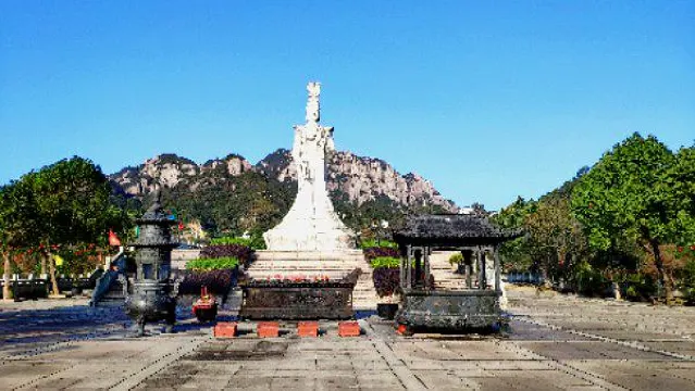 太姥娘娘雕塑位於太姥山玉湖遊覽區,其左邊是烏龍崗,右邊是虎頭崗,前眺東海福瑤列島,背靠摩霄峯,正合了左青龍、右白虎、前朱雀、後玄武的堪輿玄理。2001年10月3日,雕像奠基,動土時天空忽現絢麗的彩虹,反覆五次,在場的人無不驚訝稱奇,疑是太姥娘娘乘九色龍馬駕還。雕像由288塊花崗巖組成,疊高18層,高20.88米(含基座),台階的台數、級數,都暗合道教所推崇的數字“九”。雕像造型方中有圓,以方為主,吸收了北魏石窟雕像的秀骨清相的特點,揉進少許盛唐時代人物面部的豐潤,同時又從漢俑中吸取單純簡潔之韻味,使得雕像造型顯得敦厚、祥和、仁慈和智慧。狀為迎海風徐徐前行,頭略低垂,慈目微啟,時時關注着山下芸芸眾生;左臂彎起,指擎靈芝,給人間灑下關愛;右手執拂塵,欲將天下瘴氣迷霧掃盡。